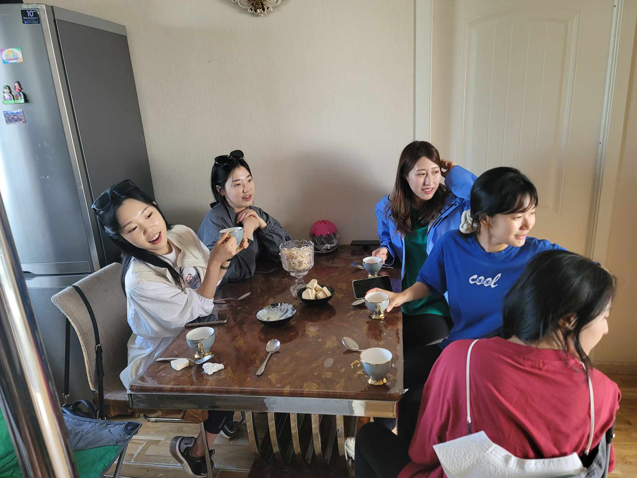 이날은 무려 7시간을 이동해야 했기 때문에 간단한 조식을 먹고 바로 출발했다. 비포장도로를 7시간이나 달려야 한다. 비포장도로라 엄청나게 흔들거려 잠이 안 올 줄 알았는데 우리는 모두 너무나도 잠을 잘 자버렸다. 그러다 가이드님이 갑자기 내리라고 하셨는데, 사막 한복판이 아닌 어느 마을의 집 앞이었다. 기사님 집이라고 한다. 기사님이 볼일 볼 것이 있어 잠깐 들르셨다고 하는데, 우리 보고 집 안으로 들어오라고 하셨다(!). 너무 놀랐다. 그렇게 우리는 계획에 없던 몽골 가정집을 방문하게 되었다.