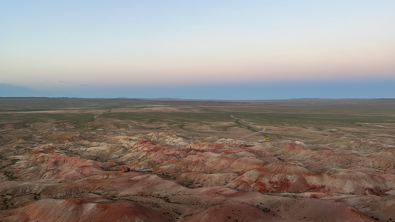 7시간을 달려 도착한 곳은 ‘바양작’. 불타는 절벽이 위치한 곳이다. 게르에 짐을 풀고 석식을 후다닥 먹고 불타는 절벽으로 갔다. 석양이 질 때, 절벽들이 붉은색으로 물들어 마치 불에 타는 듯한 풍경을 연출한다고 한다. 하지만 우리가 좀 늦어서 그런지 석양이 이미 져버린 상태였다. 아쉬웠지만, 그래도 아름다웠다. 화성이 이런 느낌일까?