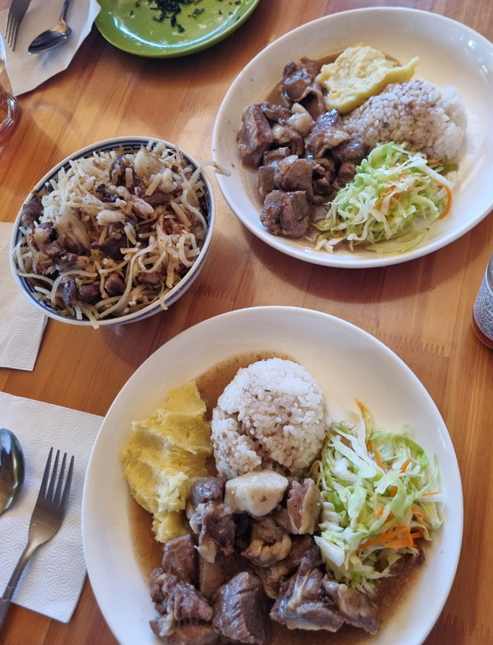 그러고는 다시 사막을 달렸다. 중간에 점심식사를 하러 들른 음식점에서 양고기를 먹을 수 있었다. 몽골에 온 이후 첫 양고기였다. 생각보다 괜찮았다. 냄새도 별로 안 나는 것 같았다. 이 정도 향이라면 몽골에서 내내 먹어도 아주 괜찮을 것 같았다(이것은 오산이었다!). 식사를 마치고 사막을 한참 달리다가 부촌 같은 마을에도 들르게 되었다. 가이드님이 여기에는 카페가 있다고 했다. 우린 커피, 그리고 시원한 얼음이 너무나도 절실했다(참고로 게르에는 냉장고가 당연히 없다). 게다가 아이스 아메리카노를 판다고 한다! 사막 가운데 오아시스를 만난 기분이었다. 급히 커피 수혈을 마치고 다음 숙소로 출발했다.