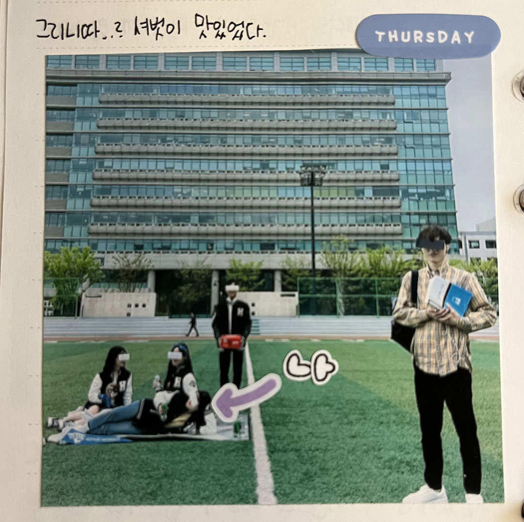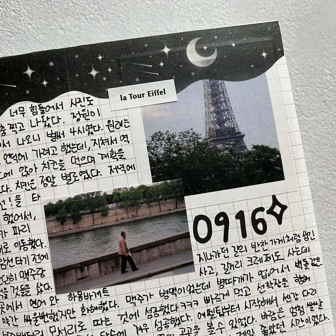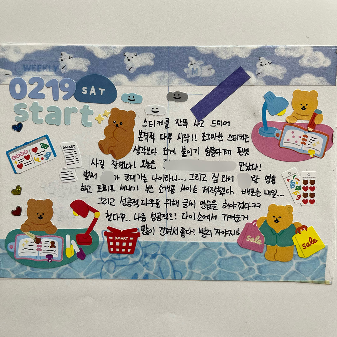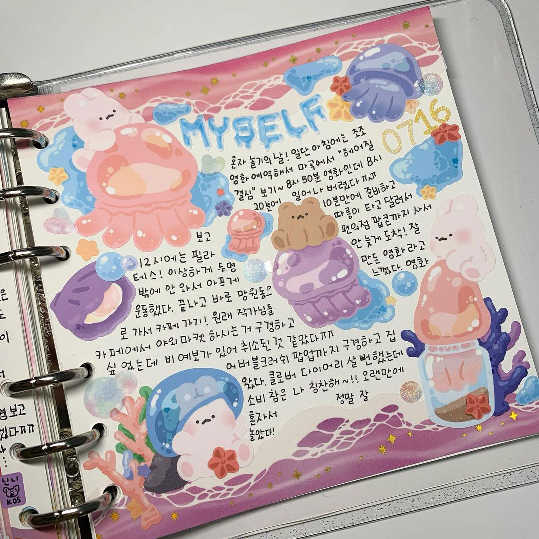저는 다꾸를 할 때 조용한 팝송이나 피아노 음악을 틀어두고 하는 걸 좋아해요. 잔잔한 음악 속에서 스티커와 사진들을 오려 붙이고, 사각사각 글씨를 쓰는 것에 집중하다 보면 잡생각들은 사라지고 다꾸에만 집중하게 돼요. 어떤 마테가 더 잘 어울릴지, 스티커를 어느 위치에 붙일지 고민하고 예쁘게 완성됐을 때 스스로 만족감도 있어요. 그리고 취향에 맞는 귀여운 스티커들을 마음껏 사용할 수 있으니 더 행복한 것 같아요ㅎㅎ