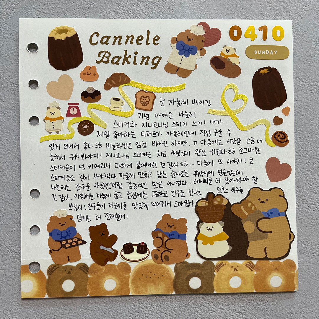 마지막으로 가장 중요한 스티커! 다꾸의 시작과 끝은 스티커라고 할 수 있어요. 마음에 드는 스티커를 가득 붙여주기만 해도 다꾸가 완성돼요. 한 장에 있는 스티커를 다 써서 다꾸하면 ‘한판다꾸’라고 하는데, 같은 스타일의 스티커를 쓰기 때문에 통일감을 줄 수 있어요. 조화를 고민할 필요가 없기 때문에 쉽게 다꾸를 완성할 수 있지만, 다른 스티커들을 함께 쓰면서 조화를 고민해보는 것도 재밌답니다.