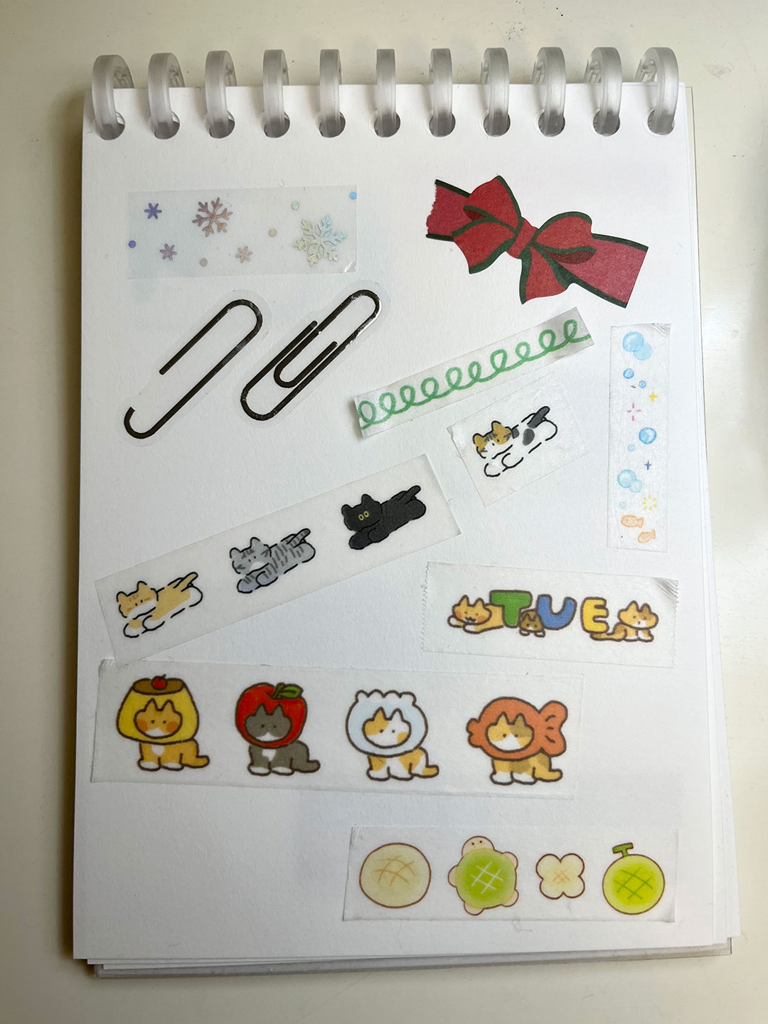 색깔이 있는 마테로 주변을 둘러주면 테두리가 꽉 차서 좀 더 가득하게 꾸민 느낌을 줄 수 있어요. 혹은 위쪽 테두리에는 하늘, 아래는 바다나 풀숲 모양 마테를 붙여서 배경을 만드는 방법도 있어요. 지금 보여드리는 다꾸도 마테로 분홍색 하늘과 초록 풀밭을 배경을 만든거에요.길게 배경으로 붙이는 마테 말고도, 작게 잘라서 포인트로 쓸 수 있는 마테들도 많아요! 귀여운 동물들을 포인트로 써주거나, 눈송이를 배경에 몇 개씩 달아주면 아주 귀여워요 :)
