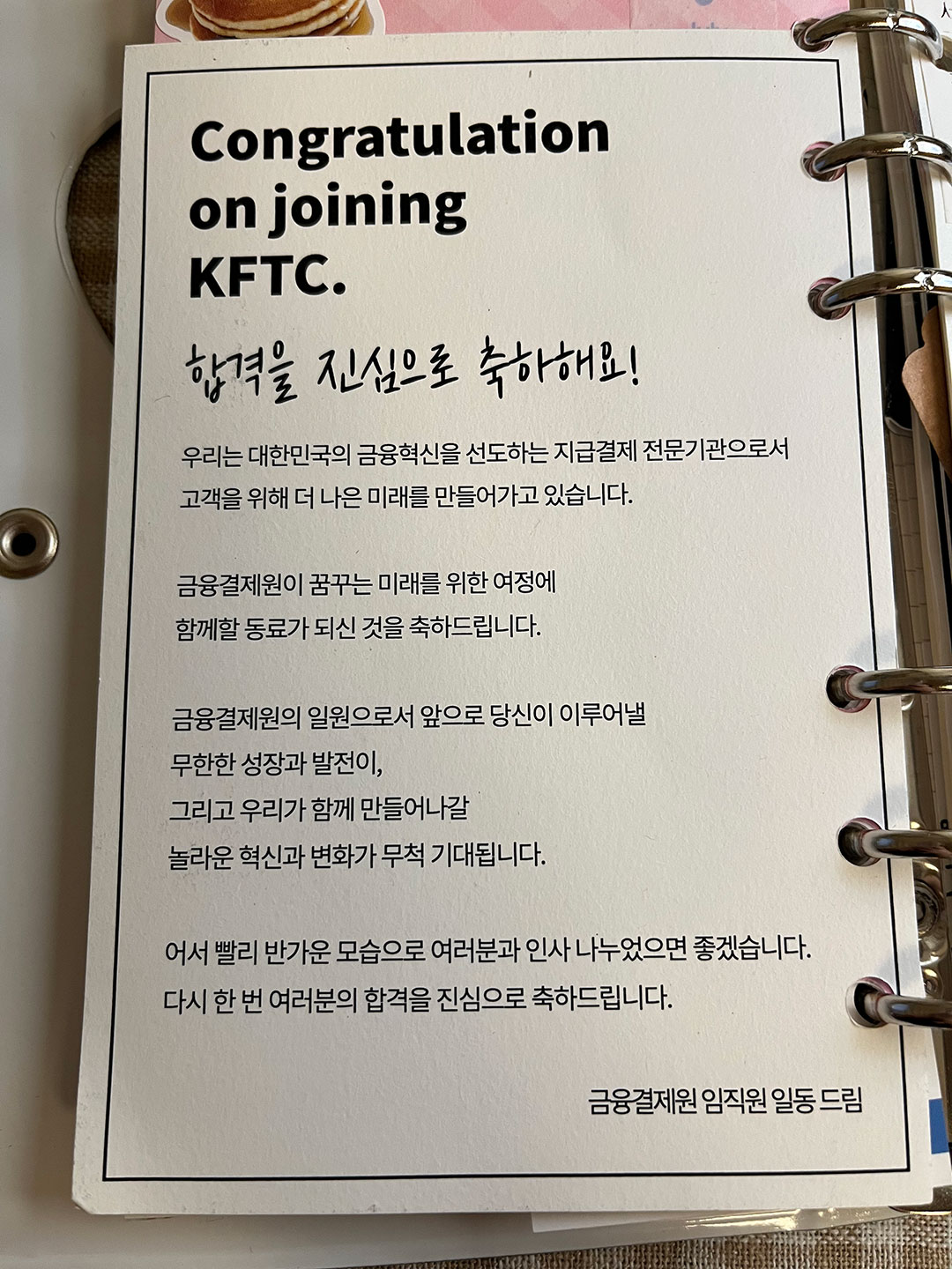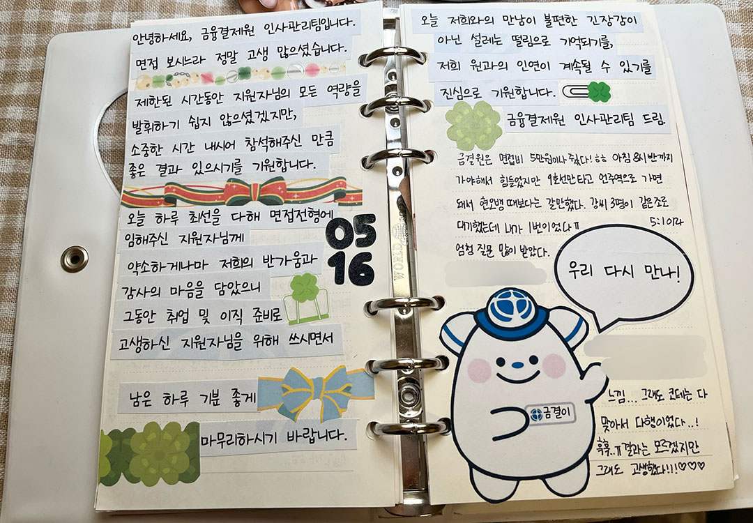 금결원 입사를 준비하면서도 다꾸를 틈틈이 했었는데요. 저는 면접 볼 때 인사팀에서 준비하신 편지가 정말 인상 깊었어요. 봉투에 그냥 면접비만 넣어 주신 게 아니라, 따뜻한 편지 한 통과 함께여서 감동이었어요. 편지를 그냥 버릴 수가 없어서 소중히 다이어리에 붙여두었답니다. 다이어리의 가로가 A4보다 작은 바람에 조각조각 잘리긴 했지만요ㅎㅎ