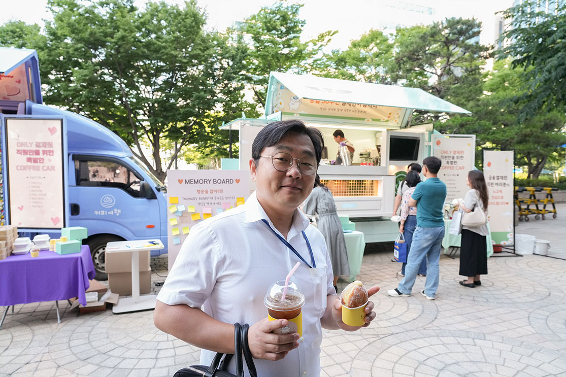 역삼과 분당 센터 1층 앞에선 커피 트럭과 함께 축하글을 남길 수 있는 메모리보드 이벤트가 진행되었습니다. 커피 트럭은 연예인들이 드라마나 영화 촬영 현장 앞에서 찍는 인증 사진으로만 접했었는데, 이번 이벤트를 통해 커피 트럭을 보니 신기한 마음이 들었습니다. 산뜻한 날씨, 손에는 커피와 과일, 도넛이 있어 업무 환경이 상쾌하고 달콤했습니다.