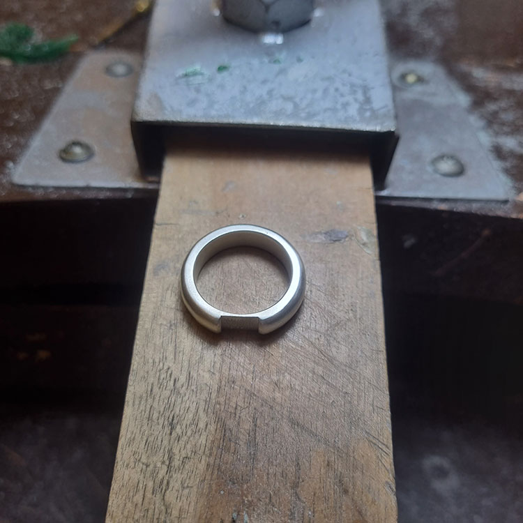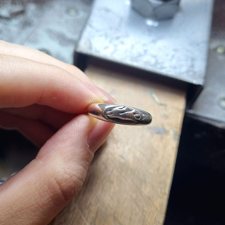 제가 맨 처음 작업한 작품입니다. 처음 갔을 때 반지가 가장 쉬울 줄 알고 단순한 모양의 반지를 먼저 만들고 싶었습니다. 그런데 제 손가락 크기에 맞춰 왁스도 파내야 하고, 균형 있게 두께를 맞춰 다듬어야 하니 생각보다 쉽지 않은 과정이었습니다. 제 작품 중에서 은을 비롯한 다른 재료들도 가장 많이 사용했습니다. 그래서인지 실제로 많이 묵직합니다.