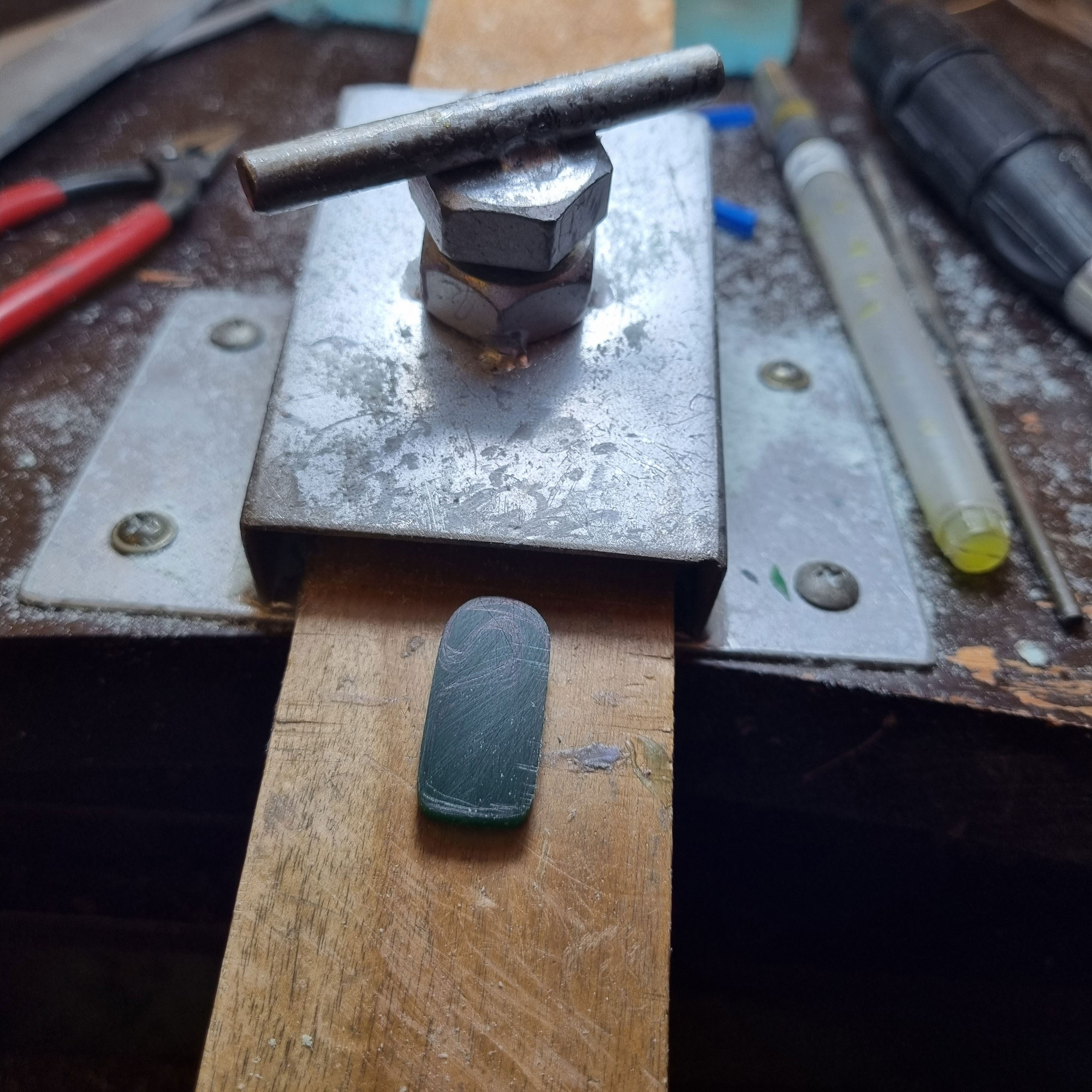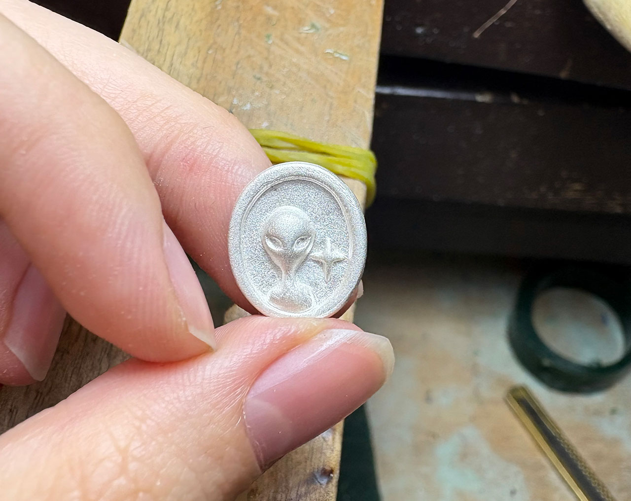 왁스카빙은 금속공예의 일종으로 왁스(Wax)와 카빙(Carving, 조각술)의 합성어입니다. 양초 같은 파라핀 소재의 왁스를 도구로 깎고 다듬어, 직접 원하는 형태로 만들어가는 것을 말합니다. 사진 속 작업대 위의 초록색 덩어리가 왁스입니다.