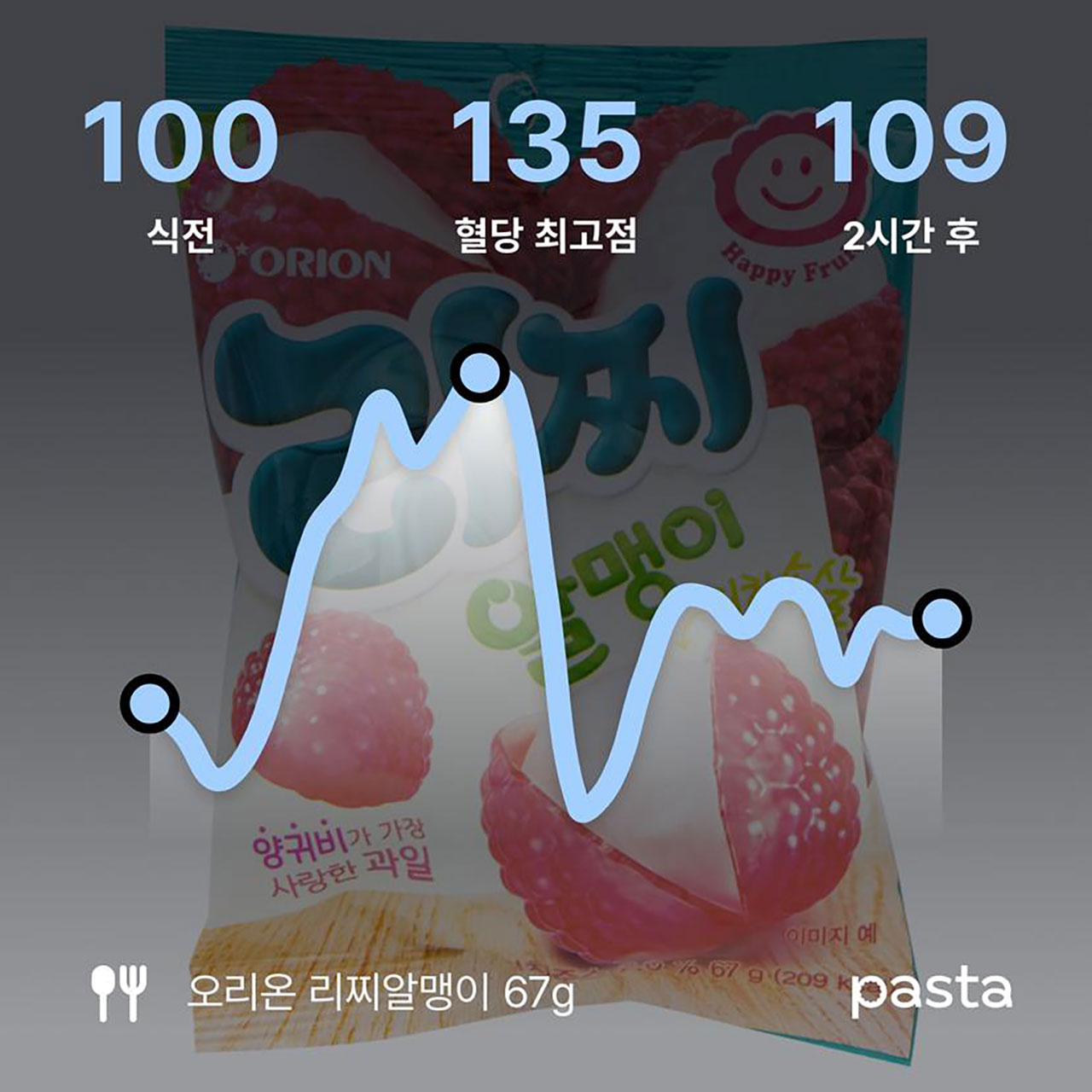 적은 양으로도 혈당이 많이 오른 음식 중 하나는 젤리였습니다. 손바닥 크기의 젤리 한 봉지만으로 식사한 만큼이나 혈당 수치가 올랐습니다. 아무리 군것질하고 싶어도 젤리만큼은 피해야겠습니다.