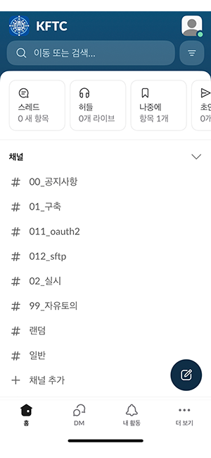 슬랙은 대표적인 메시지 기반 협업 채널입니다. 우리 원에서 쓰는 매터모스트(Mattermost, 오픈 소스 온라인 채팅 서비스)와는 쌍둥이 같은 모습을 가졌죠! 매터모스트는 서버를 보유한 사용자가 설치해서 사용하는 온프레미스 방식(On-premise, 자체적으로 보유한 서버에서 운영하는 우리 원과 같은 방식)과 SaaS(Software as a Service, 서비스형 소프트웨어)가 둘 다 가능하며, 슬랙은 서버 없이 SaaS로 사용하는 경우 공간 개설 및 계정 가입 절차가 간단한 특징이 있어 최종적으로 슬랙을 선택했습니다. 슬랙은 담당자의 업무 환경에서 웹브라우저로 접속할 수 있어 편리하지만, 금융회사 특성상 슬랙 사이트는 차단된 경우가 많습니다. 그러나 담당자 휴대전화에 슬랙 앱을 설치하면 카톡처럼 사용할 수 있습니다.