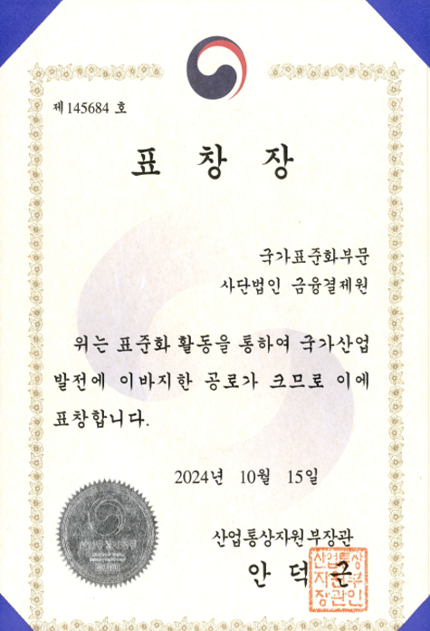 금융 분야 표준 개발·정비 등의 금융업무 표준화를 위해 힘썼기에 금융결제원의 공로를 인정받을 수 있었습니다. 앞으로도 우리나라 금융 고객의 이용 편의성 제고를 위해 노력하겠습니다.😄