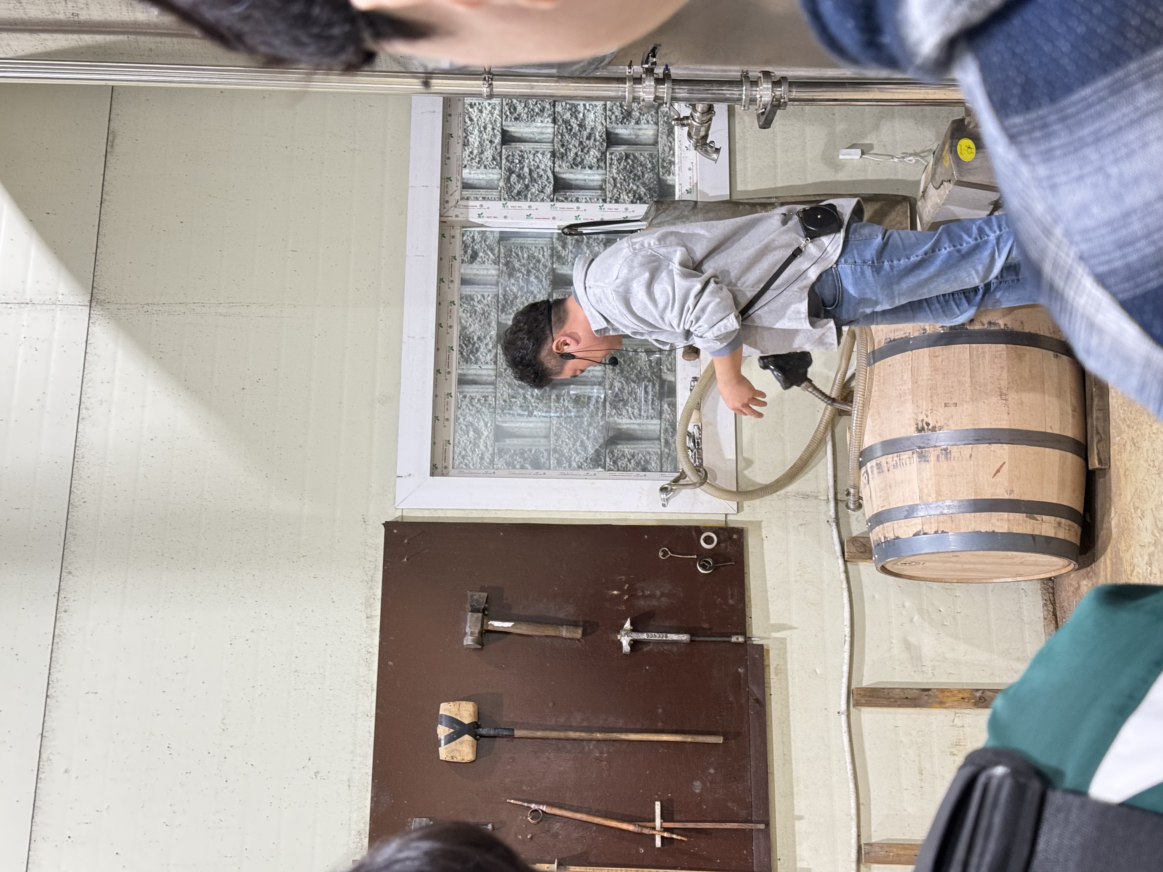 숙성고에 들어서자 오크향이 훅! 밀려왔어요. 이곳에는 스피릿 저장통과 다양한 오크통들로 가득했죠.
