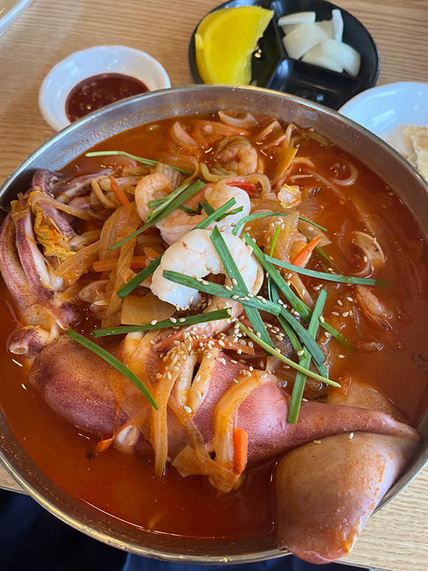 다음 날 점심, 전날의 진한 도파민 여운은 숙취로 찾아왔고, 저희는 해장 맛집 ‘여래향’으로 향했습니다. 대표 메뉴는 통오징어짬뽕! 국물은 얼큰하고 시원, 오징어는 통째로 들어가 씹는 맛이 일품이었죠.