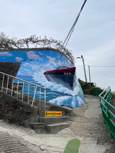 논골담길은 벽화마을이에요. 골목을 따라 올라가면 묵호 등대에도 갈 수 있답니다. 사실 벽화에는 크게 감흥이 없는 편인데요. 그래도 높이 올라가서 보는 마을의 풍경이 좋았습니다. 무엇보다 무코야 선물 가게는 이번 여행 최고의 포토 스팟 중 하나입니다! 무코야 선물 가게에 들어가는 설정샷도 하나 남기고, 가게 옆쪽으로 가서 파란 하늘-파란 지붕-파란 바다 조합으로 사진 찍는 것도 추천해 드려요!