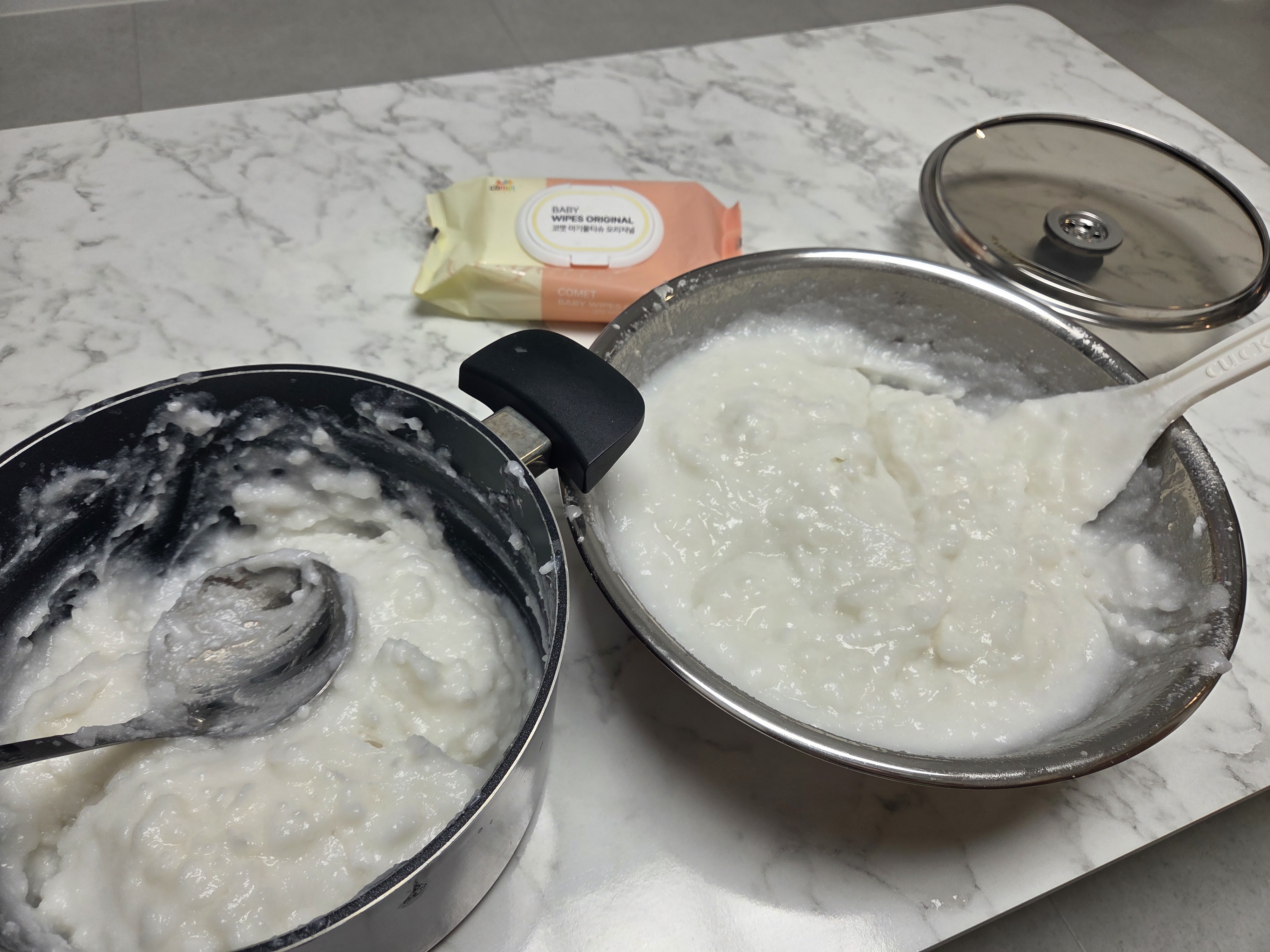 밑술을 하는 방법은 크게 죽, 범벅, 백설기 세 가지가 있는데, 범벅을 기준으로 설명해 드리겠습니다. ‘물에 불리기 전’ 쌀 무게를 기준으로 2.5~3배의 끓는 물을 쌀가루에 부어줍니다. 식기 전에 바로 치대면서 쌀가루를 익히면 아래 사진에 보이는 것처럼 범벅이 되는데요, 이 범벅을 상온이 될 때까지 식혔다가 누룩을 넣고 치대줍니다. 이때 절대로 쌀을 선풍기로 식히면 안 됩니다! 밥을 밖에 오래 두면 쌀이 굳는 현상을 ‘노화’라고 하는데, 노화가 되면 전분질이 갇혀 효소를 넣어도 당화가 잘되지 않아 술이 제대로 만들어지지 않습니다. 이 밑술을 25℃ 이하의 환경에서 잘 보관하고 시간이 지나면 그 끈적하던 범벅이 풀어지고 발효가 진행됩니다.