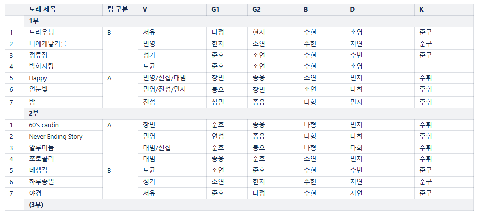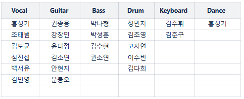 합주 연습을 시작하기에 앞서, 멤버들의 희망 세션과 합주 신청곡 리스트를 받았습니다. 인원이 많아서 일부 세션으로 몰리지 않을까 걱정도 되었지만, 키보드 외에는 다행스럽게도 원하는 세션으로 고르게 나눠졌습니다.