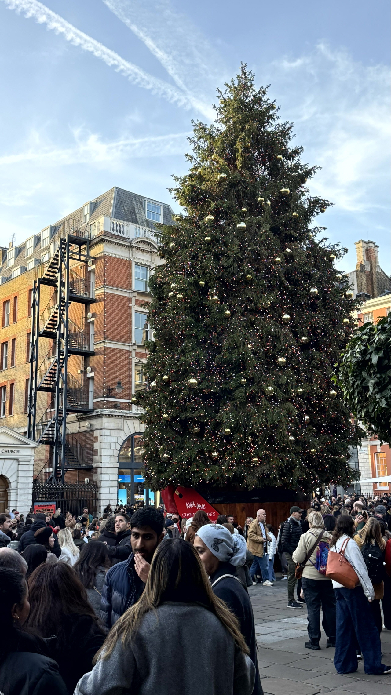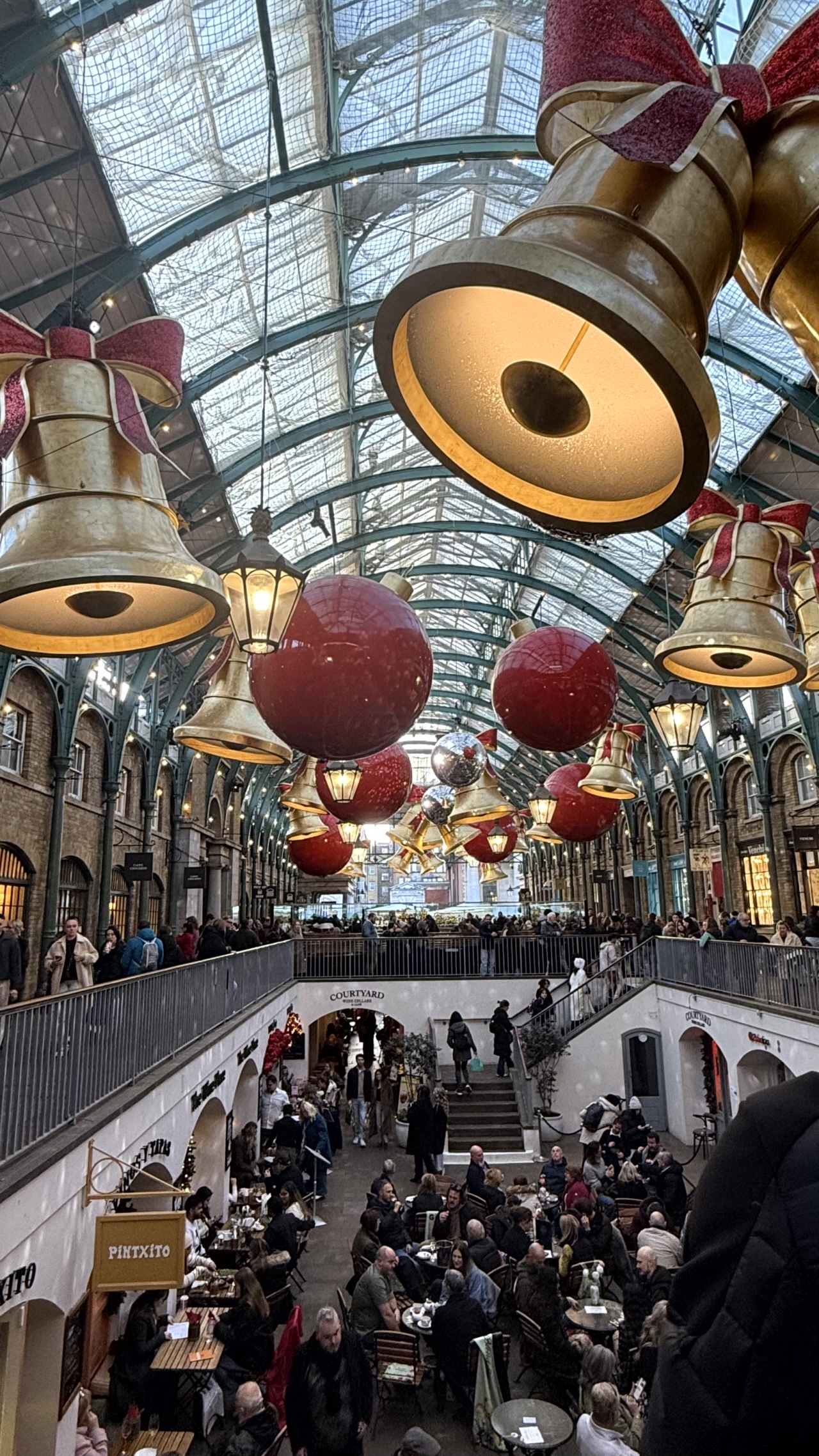 런던의 핫플레이스! 코벤트 가든에도 크리스마스 마켓이 열립니다. 거대한 트리를 지나 애플 마켓 안으로 들어가보면, 수많은 종이 장식된 모습을 볼 수 있습니다. 거대한 종들이 달려 있는 모습을 보니 굉장히 압도당하는 기분이었어요!