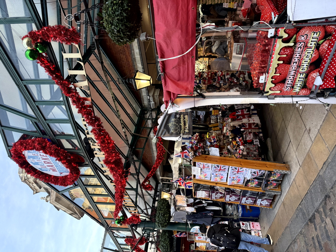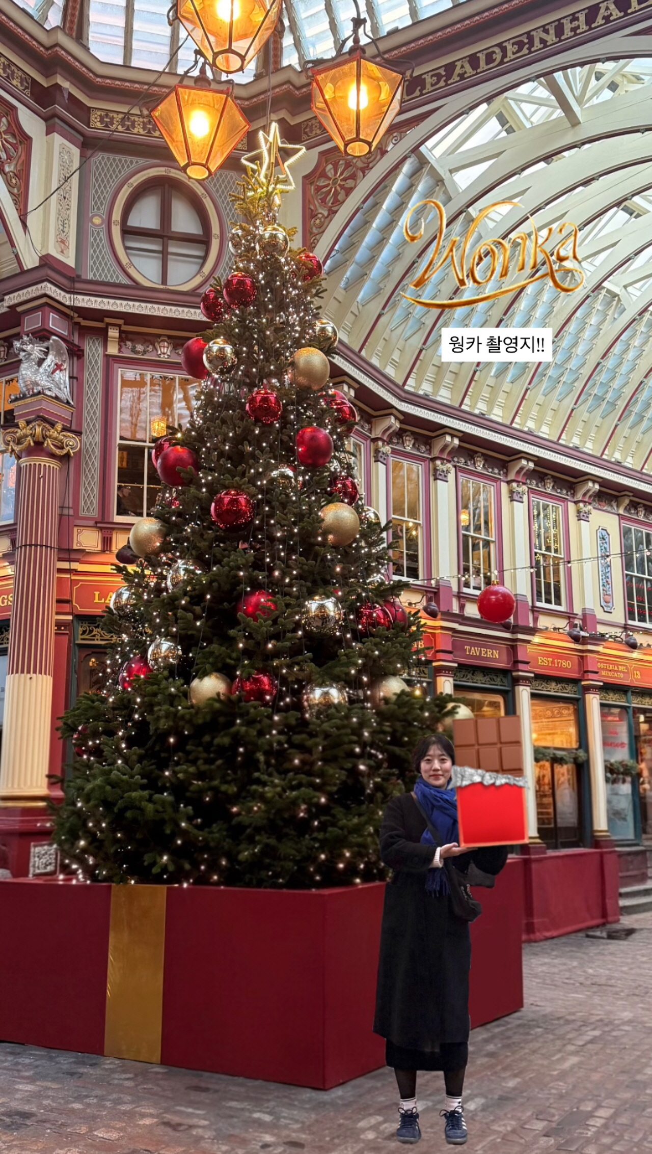 다들 영화 <해리포터>와 <윌리 웡카> 보셨나요? 해리포터의 다이애건 앨리 거리와 웡카가 처음 초콜릿을 판매한 거리의 모티브가 된 곳이 바로 여기 리든홀 마켓입니다! 규모는 굉장히 작았지만 예쁜 트리와 빨강 초록으로 알록달록 꾸며진 벽 때문에 어느 곳보다 크리스마스 분위기가 가득했습니다. 저도 웡카처럼 초콜릿을 판매한다는 컨셉으로 사진을 꾸며 봤는데, 그럴듯한가요?