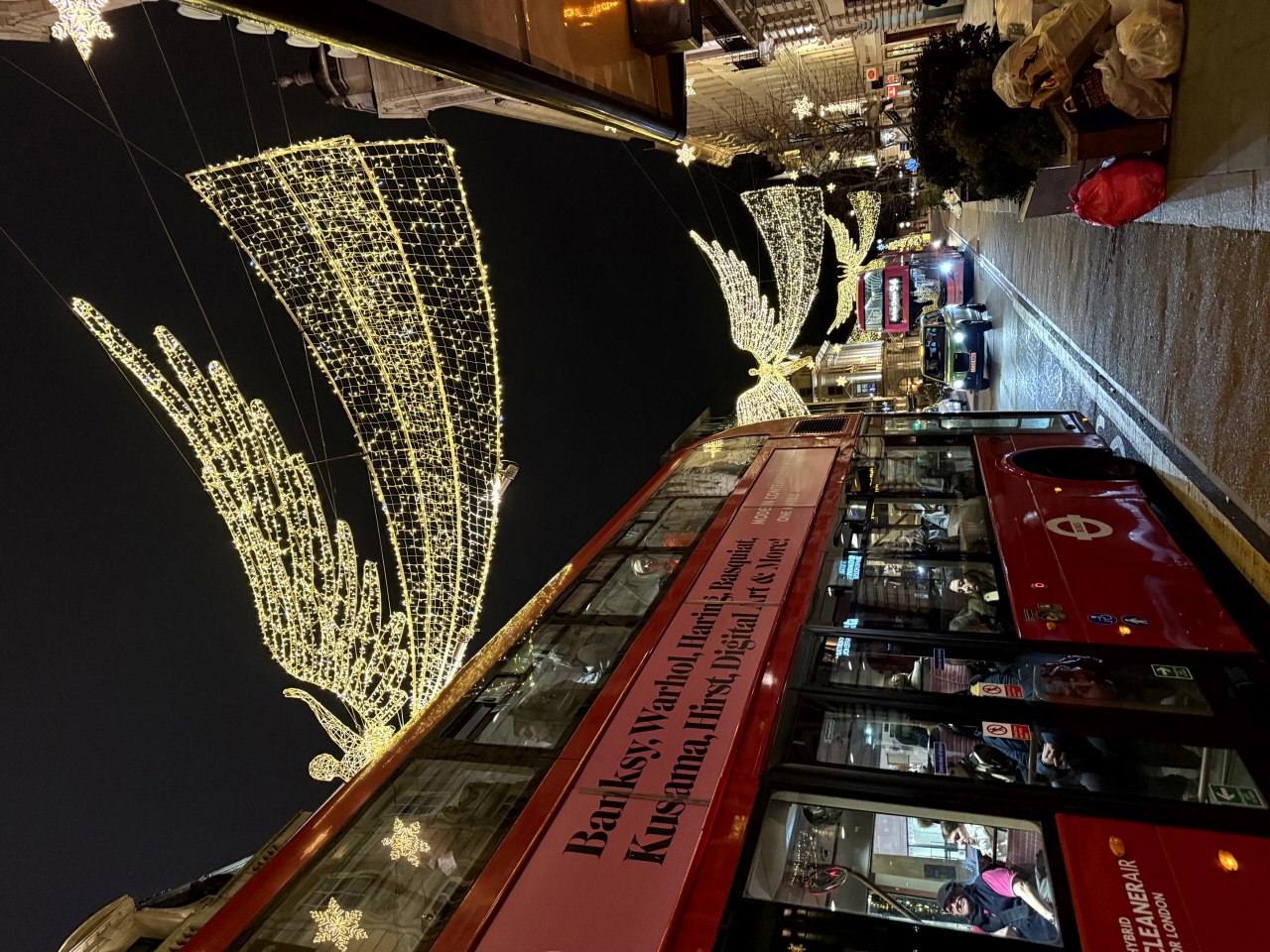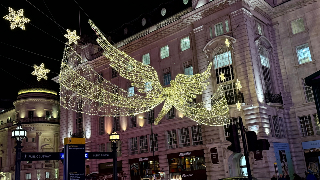 다음은 런던의 리젠트 거리입니다! 이곳은 마켓은 아니지만 크리스마스를 맞이해 곳곳에 천사 모양 조명이 걸려있는데요. 천사들의 포즈가 모두 다르다는 것을 아시나요?
