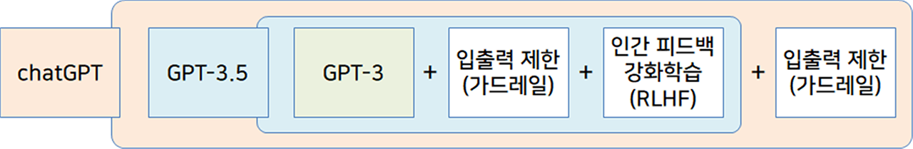 ChatGPT는 GPT-3.5에 보다 엄격한 입출력 제한 기능(가드레일)이 적용된 인공지능 모델을 사용하였다.
