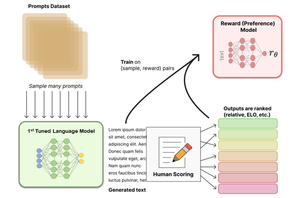 (3단계, 보상모델 생성) 미세조정된 언어모델이 생성한 답변에 대해 사람이 직접 평가(scoring)하고 답변과 평가결과를 학습하는 보상모델(Reward Model)을 생성