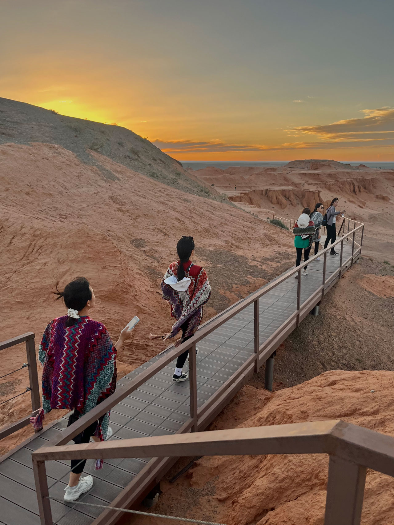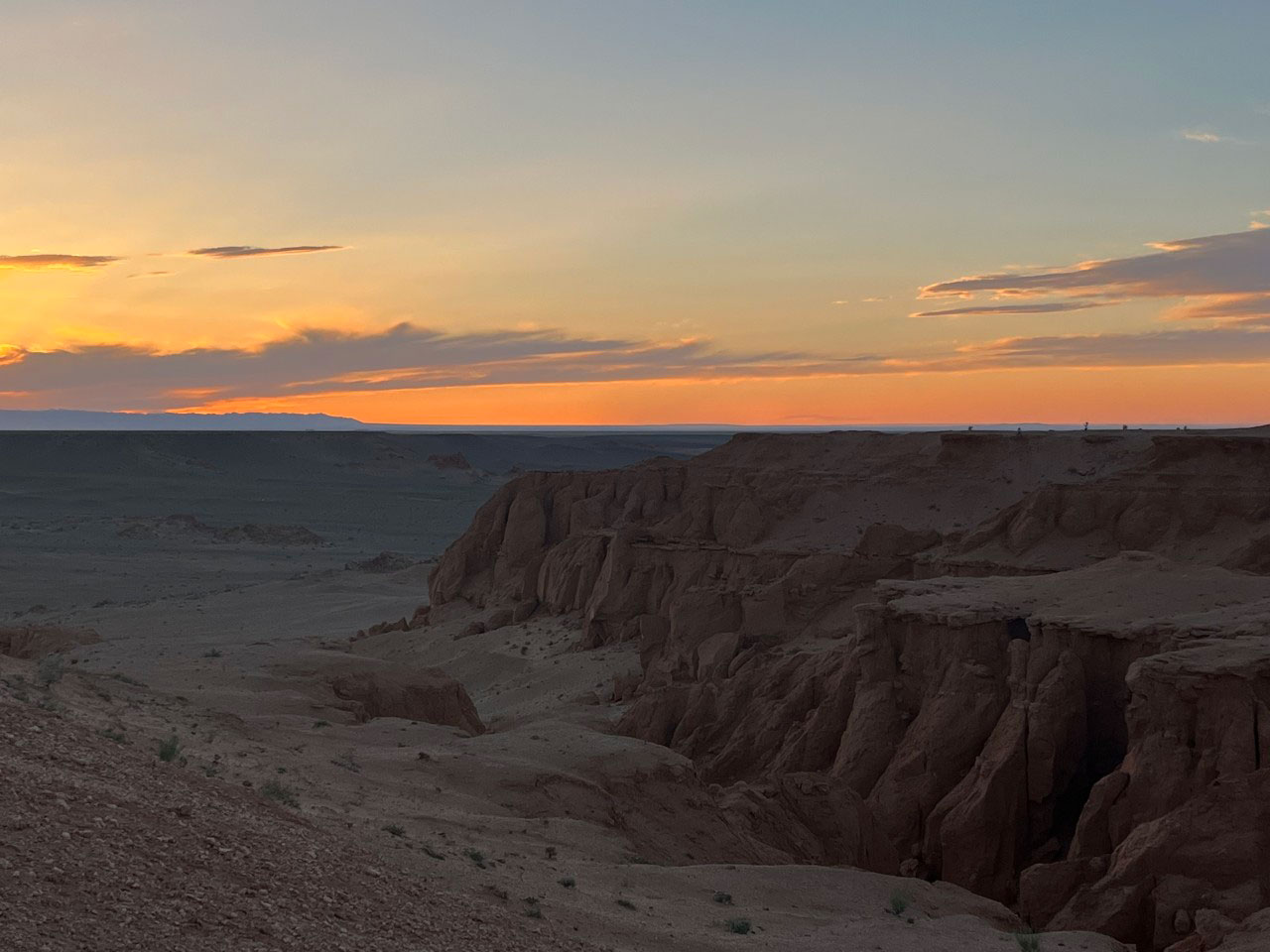 7시간을 달려 도착한 곳은 ‘바양작’. 불타는 절벽이 위치한 곳이다. 게르에 짐을 풀고 석식을 후다닥 먹고 불타는 절벽으로 갔다. 석양이 질 때, 절벽들이 붉은색으로 물들어 마치 불에 타는 듯한 풍경을 연출한다고 한다. 하지만 우리가 좀 늦어서 그런지 석양이 이미 져버린 상태였다. 아쉬웠지만, 그래도 아름다웠다. 화성이 이런 느낌일까?