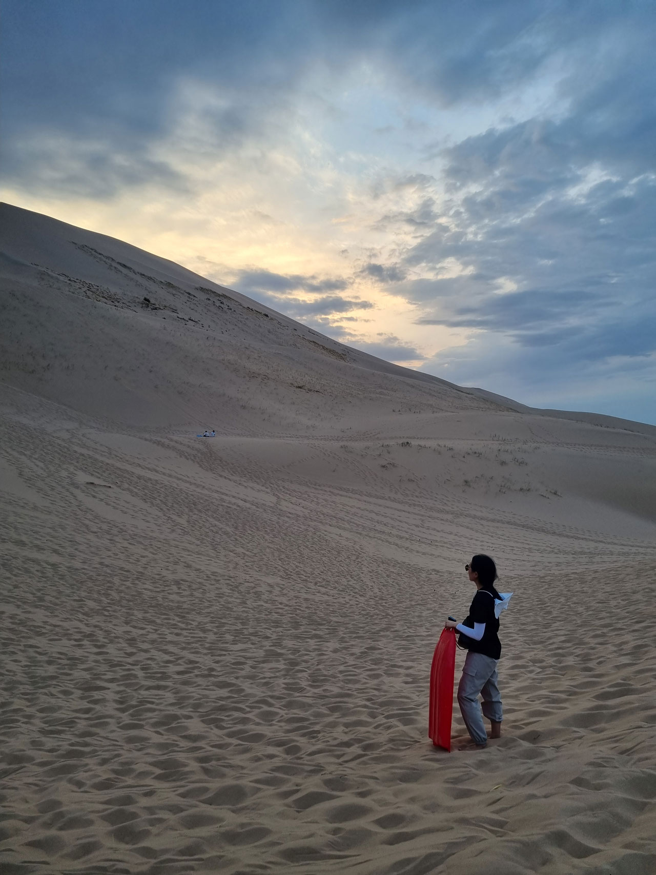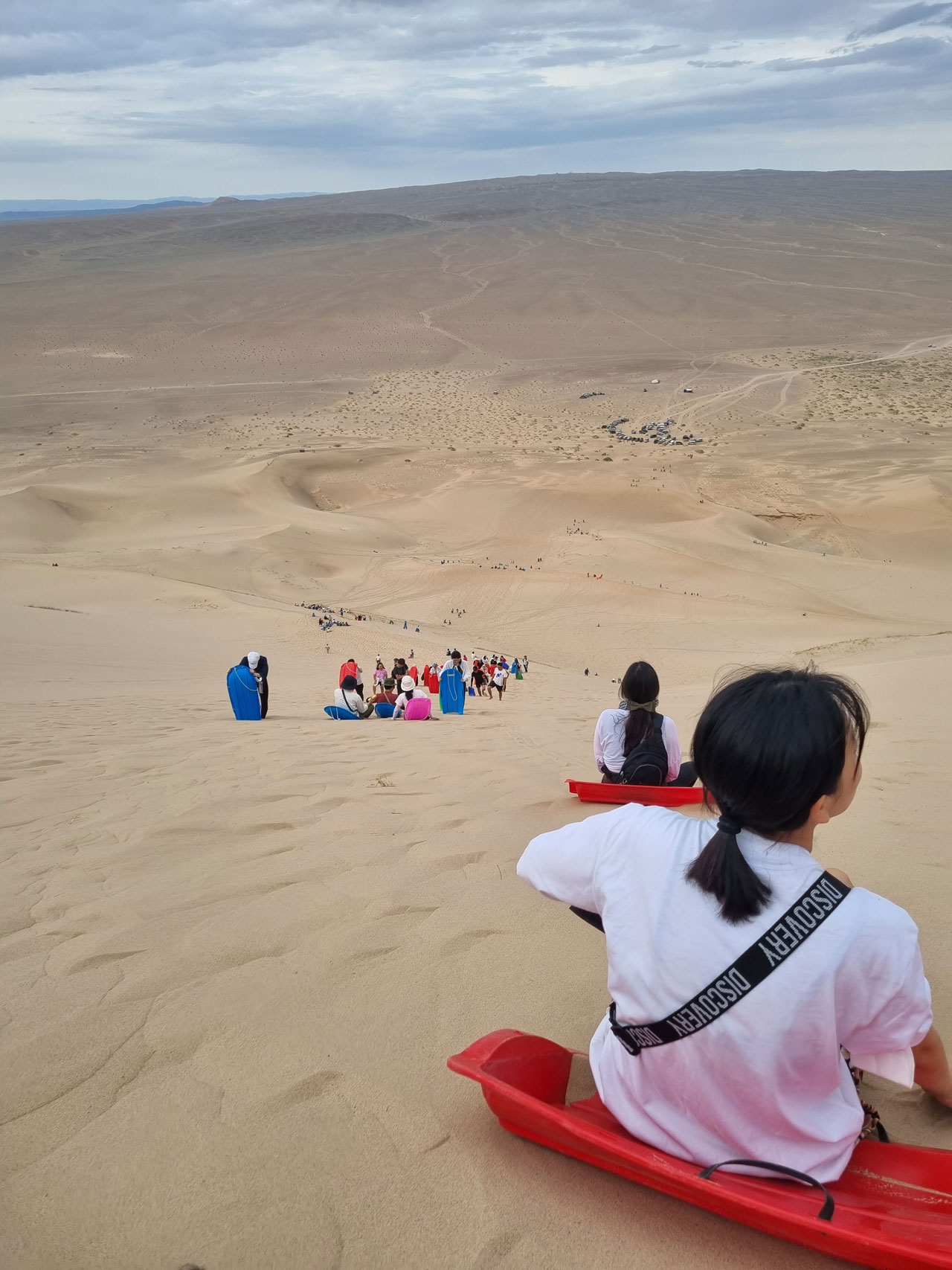 그런데 여기서 우리 중 한 명이 아프기 시작했다. 무리한 탓인지, 머리가 아프고 열이 나며 기운이 없다고 했다. 아픈 동기는 썰매를 타지 않고 가이드 언니의 손을 잡고 조심히 내려왔다. 남은 넷은 모래 썰매를 타고 내려왔다. 여기서 팁은 속도가 빠르다고 무서워서 브레이크를 밟으면 안 된다는 것이다. 속도가 빠른데 브레이크를 밟기 위해 발을 모래로 뻗는 순간, 고운 모래 속에 발이 그대로 쑥 들어가서 360도 회전을 하게 된다. 그냥 무서워도 스피드를 즐기며 끝까지 내려가자.-