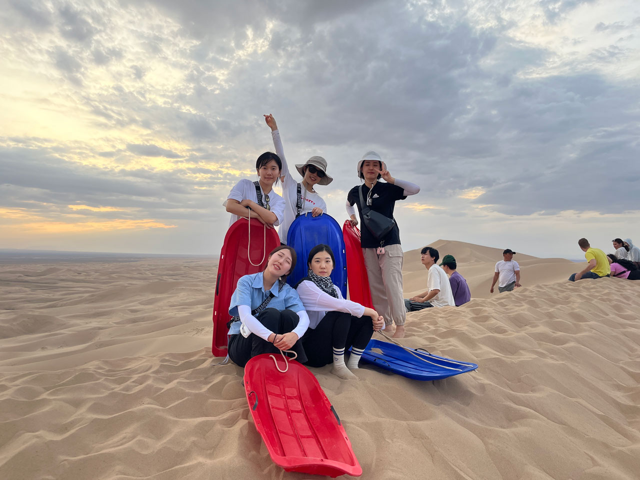 그런데 우리가 오를 모래언덕을 마주 보는 순간, 그냥 거대한 산 같은 느낌이었다(그런데 그 산이 모래로 되어있고 경사가 엄청났다). 게다가 각자 모래 썰매를 끌고 올라가야 했다. 처음부터 난관이었다. 한 걸음을 올라가면, 고운 모래 때문에 0.5 걸음은 원복한다. 너무 힘들었다. 말이 안 나왔다. 저질 체력인 나는 무조건 중도 포기할 것이라 확신했다. 중간부터는 그냥 네발로 기어 올라갔다. 물도 한 병 들고 왔지만 3/4 시점에 이미 다 마셔버렸다. 밑을 내려다보며, 여기까지 왔는데 정상에서의 풍경을 못 보면 너무 아쉬울 것 같아서 진짜 너무너무 힘들었지만 최선을 다했다. 결국 우리는 중도 포기자 없이 모두 꼭대기에 모일 수 있었다.