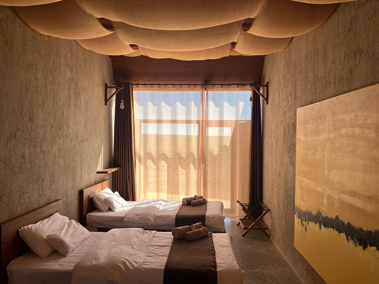 몽골의 남부 지역을 여행할 때는 대부분 게르에서 숙박을 하게 되어 좋은 숙소는 그리 많지 않다. 이날 묵게된 ‘카라반세라이’라는 숙소는 남부 지역에서 몇 안 되는 좋은 숙소라고 익히 들어 다들 기대를 많이 하고 갔다. 카라반세라이는 사막과 너무 잘 어울리는 곳이었다. 식당 앞의 테라스부터 숙소 안까지 아주 감성이 넘쳤다. 하지만 아쉽게도 밤 11시면 전기와 물이 끊기는 것은 똑같았다...