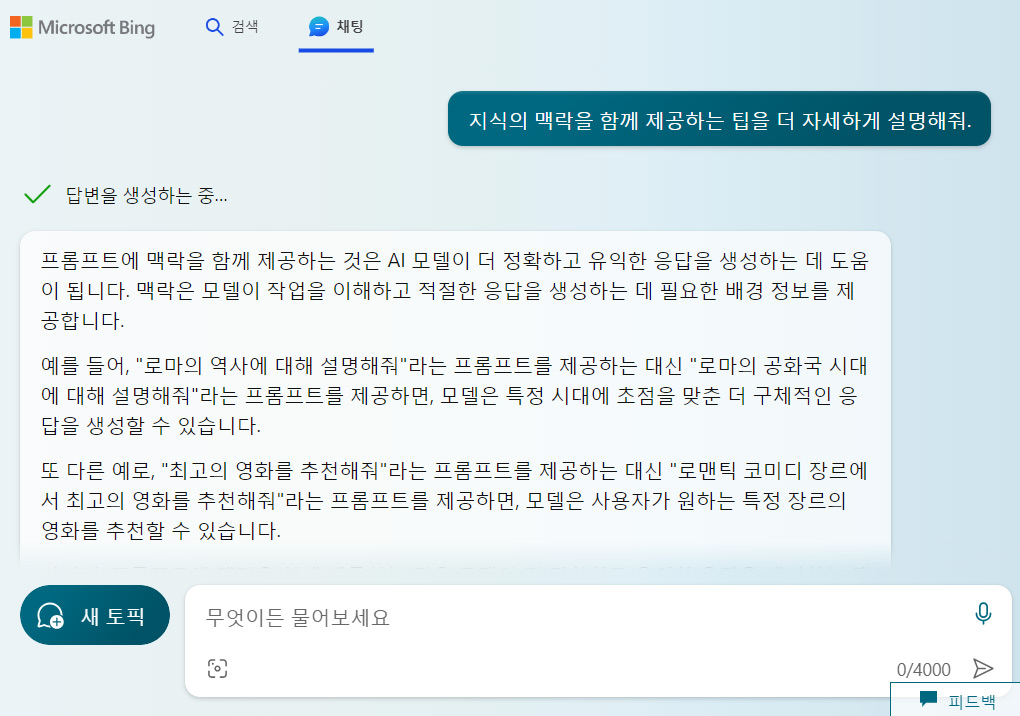 컨텍스트 고려 모델은 이전 프롬프트나 대화 텍스트를 기반으로 응답한다. 따라서 이전 대화를 고려하여 프롬프트를 작성하면 모델이 더 의미 있는 답변을 제공할 수 있다.