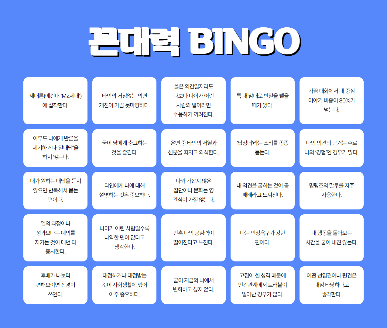 빙고 판을 따라 나의 ‘꼰대력’을 확인하면서 누군가는 흠칫할 수도, 누군가는 씁쓸한 마음이 들었을 테다. 보통 ‘꼰대’라는 수식어는 기성세대 혹은 연장자에게 따라붙지만, 꼰대 기질은 세대를 막론하고 발휘될 수 있다. 주변에서도 종종 ‘젊꼰(젊은 꼰대)’이 발견되는 것만 봐도 그렇다. 즉 꼰대의 조건은 우리가 매년 한 살씩 먹어가는 그 나이가 아니라, 잘 돌보지 않으면 훌쩍 늙어버리고 마는 마음과 생각의 나이인 셈이다.