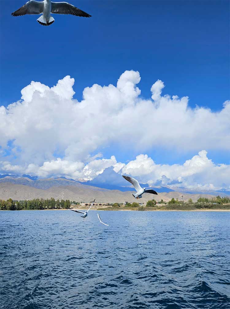 이식쿨호수 가는 길도 역시나 멋지다. 이식쿨 남부 쪽이 풍광이 더 아름다웠다. 마침내 마주한 호수는 하늘과 맞닿을 듯 새파란 모습이었고 이는 마치 바다를 연상케 했지만, 호수를 둘러싼 산맥의 절경은 호수도 바다도 아닌 특별함을 선사했다. 호수에서는 유람선 관광이 여행객에게 또 다른 즐거움을 주었다. 푸른 바다, 뭉게구름이 둥실 떠 있는 하늘, 갈매기가 날고 있는 아름다운 경치까지 모든 것이 황홀했다. 이식쿨호수는 해변도 즐길 수가 있어 여행객들의 즐거운 놀이터가 되기도 한다.