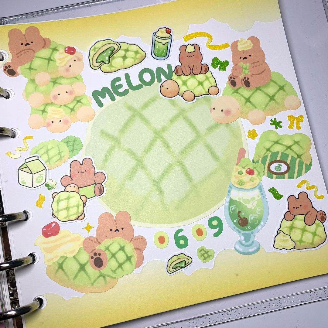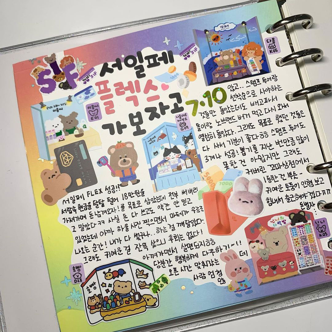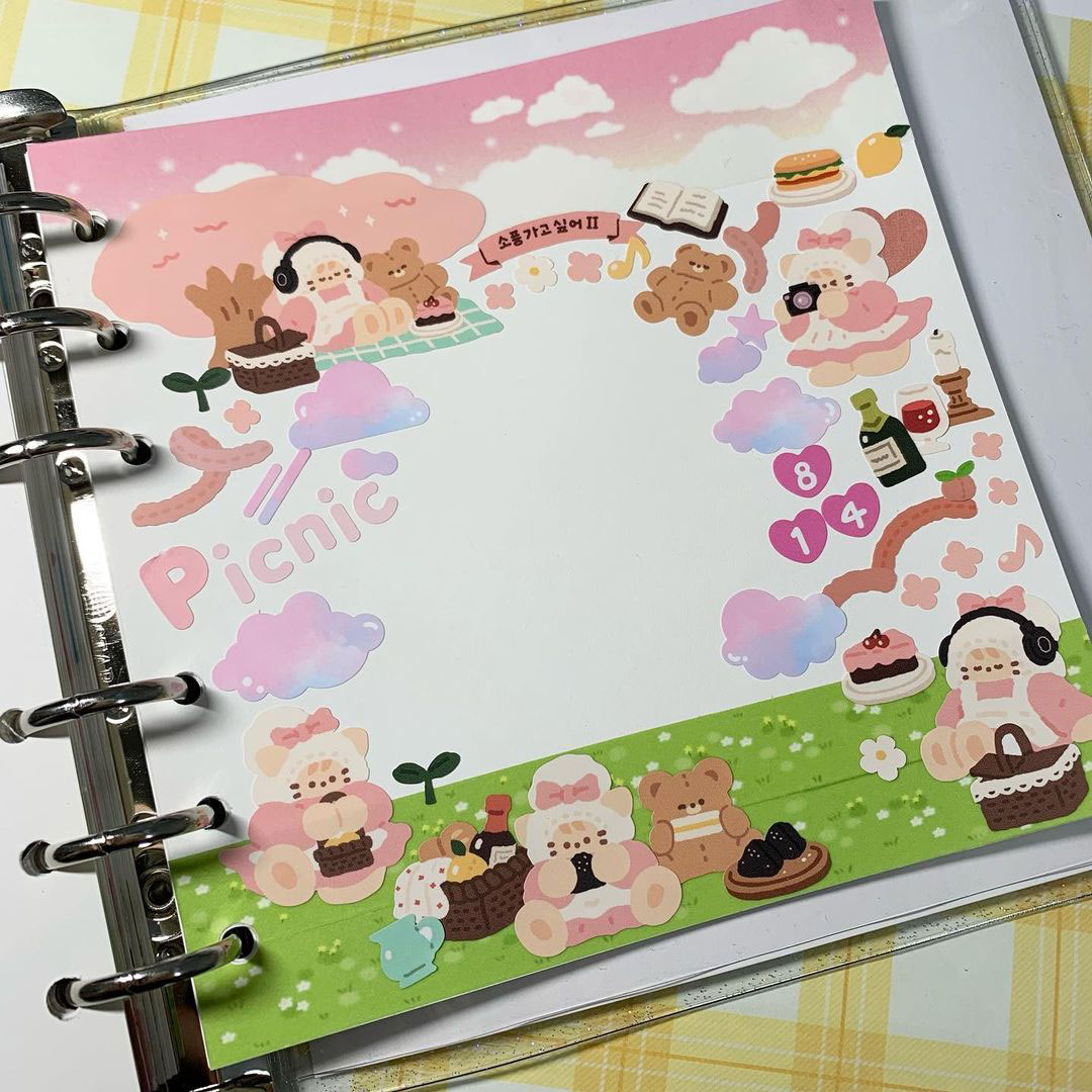 마지막으로 가장 중요한 스티커! 다꾸의 시작과 끝은 스티커라고 할 수 있어요. 마음에 드는 스티커를 가득 붙여주기만 해도 다꾸가 완성돼요. 한 장에 있는 스티커를 다 써서 다꾸하면 ‘한판다꾸’라고 하는데, 같은 스타일의 스티커를 쓰기 때문에 통일감을 줄 수 있어요. 조화를 고민할 필요가 없기 때문에 쉽게 다꾸를 완성할 수 있지만, 다른 스티커들을 함께 쓰면서 조화를 고민해보는 것도 재밌답니다.