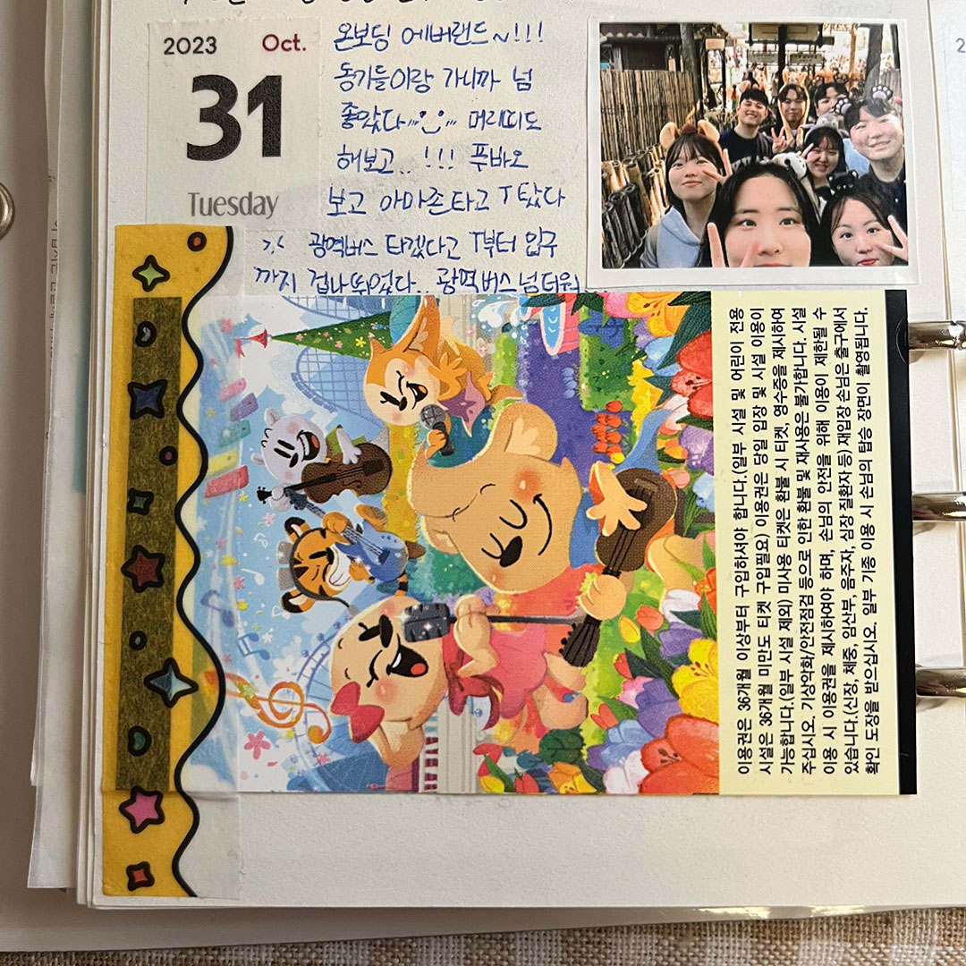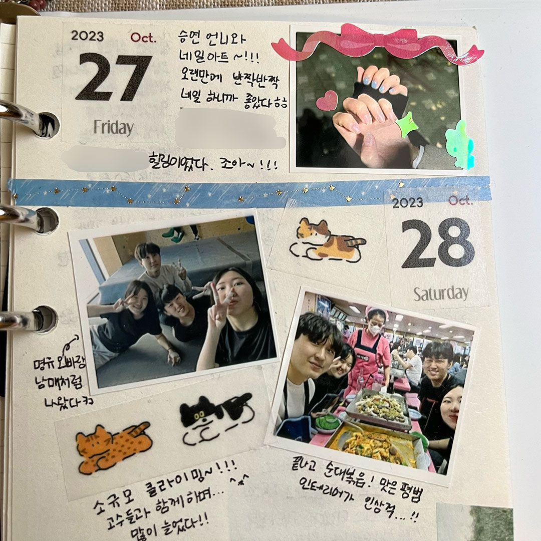 저는 다꾸를 할 때 조용한 팝송이나 피아노 음악을 틀어두고 하는 걸 좋아해요. 잔잔한 음악 속에서 스티커와 사진들을 오려 붙이고, 사각사각 글씨를 쓰는 것에 집중하다 보면 잡생각들은 사라지고 다꾸에만 집중하게 돼요. 어떤 마테가 더 잘 어울릴지, 스티커를 어느 위치에 붙일지 고민하고 예쁘게 완성됐을 때 스스로 만족감도 있어요. 그리고 취향에 맞는 귀여운 스티커들을 마음껏 사용할 수 있으니 더 행복한 것 같아요ㅎㅎ