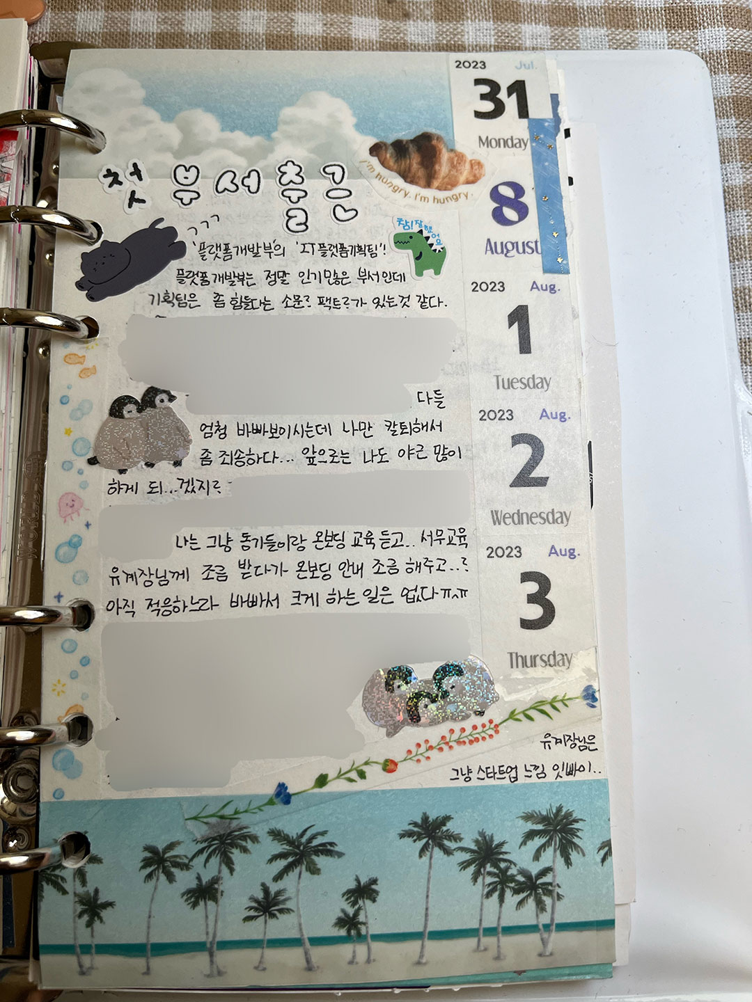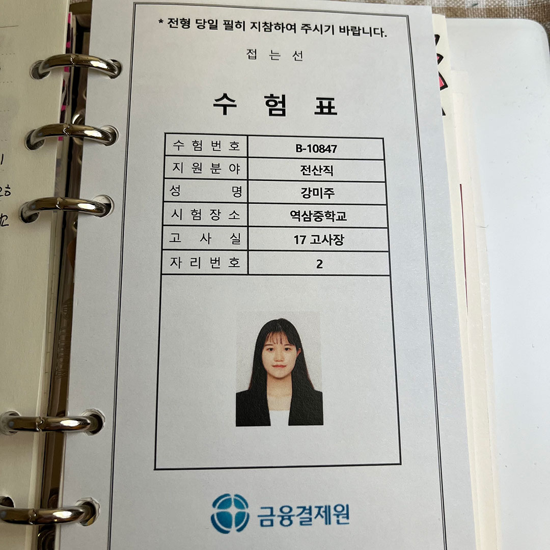 금결원 입사를 준비하면서도 다꾸를 틈틈이 했었는데요. 저는 면접 볼 때 인사팀에서 준비하신 편지가 정말 인상 깊었어요. 봉투에 그냥 면접비만 넣어 주신 게 아니라, 따뜻한 편지 한 통과 함께여서 감동이었어요. 편지를 그냥 버릴 수가 없어서 소중히 다이어리에 붙여두었답니다. 다이어리의 가로가 A4보다 작은 바람에 조각조각 잘리긴 했지만요ㅎㅎ
