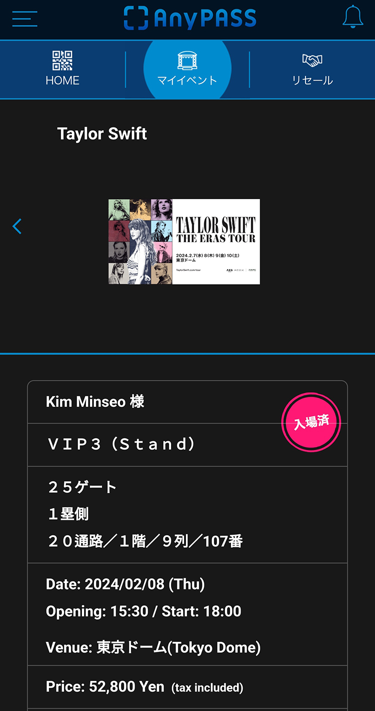 마치 공식 티켓을 구매하듯 번듯한 리세일 중계 사이트에서 안전하게 결제할 수 있습니다. 티켓 트랜스퍼 기능으로 공식 티켓 판매 사이트의 제 계정에 들어오고, 그렇게 모바일 티켓으로 당당하게 입장할 수 있었습니다.② 도쿄 공연