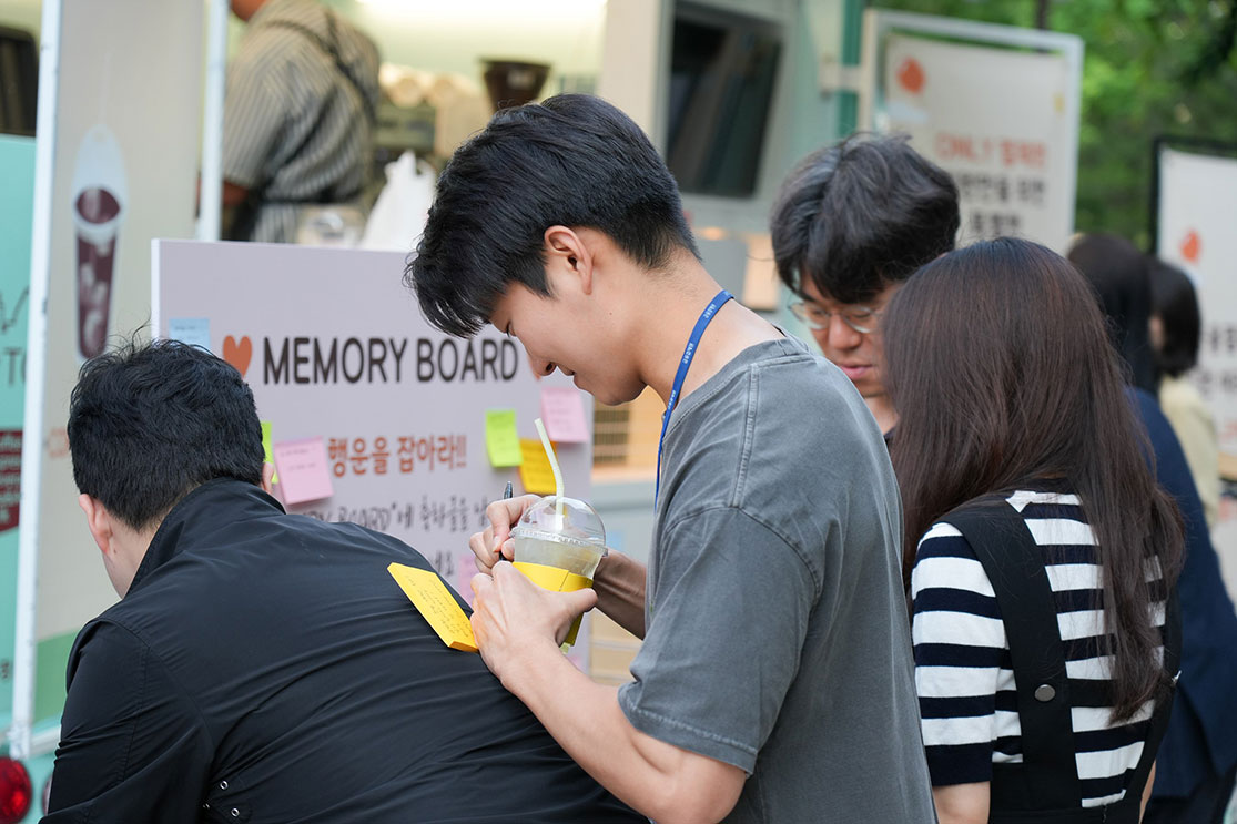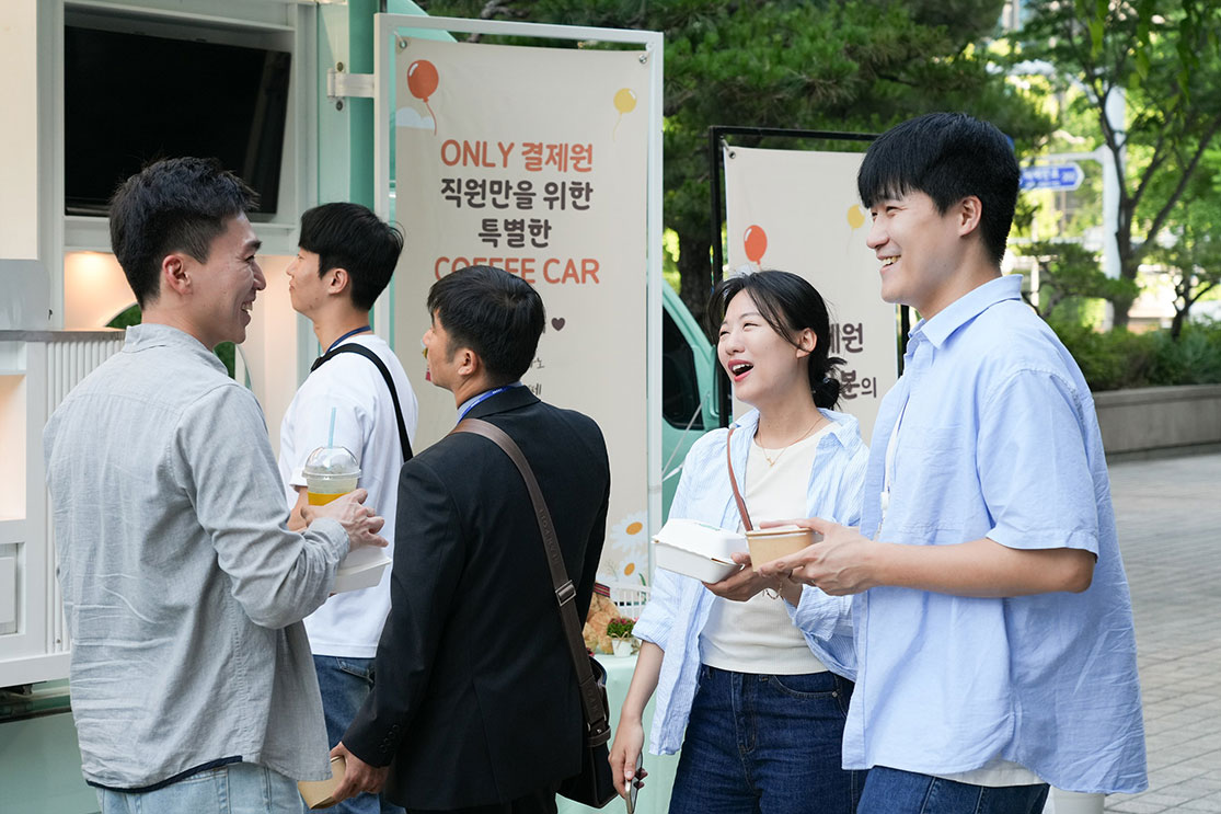 역삼과 분당 센터 1층 앞에선 커피 트럭과 함께 축하글을 남길 수 있는 메모리보드 이벤트가 진행되었습니다. 커피 트럭은 연예인들이 드라마나 영화 촬영 현장 앞에서 찍는 인증 사진으로만 접했었는데, 이번 이벤트를 통해 커피 트럭을 보니 신기한 마음이 들었습니다. 산뜻한 날씨, 손에는 커피와 과일, 도넛이 있어 업무 환경이 상쾌하고 달콤했습니다.