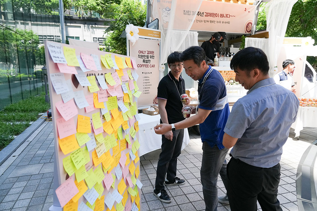 커피를 기다리며 38주년 축하 멘트도 포스트잇에 끄적끄적 적어서 붙여보고, 오랜만에 주변 동료들과 인사하고 얘기도 나눴습니다. 아마 총무부에서는 이런 따스운 풍경을 그리지 않았을까 싶습니다ㅎㅎ
