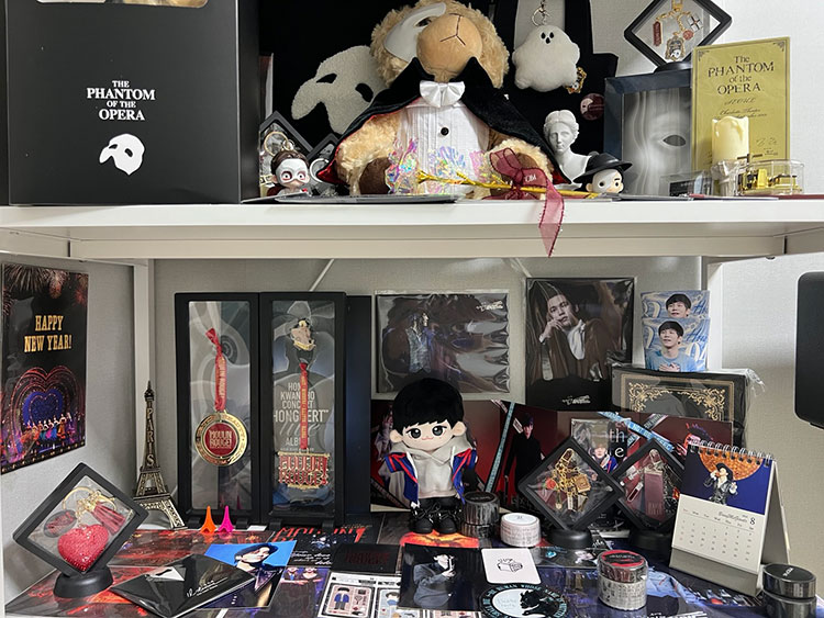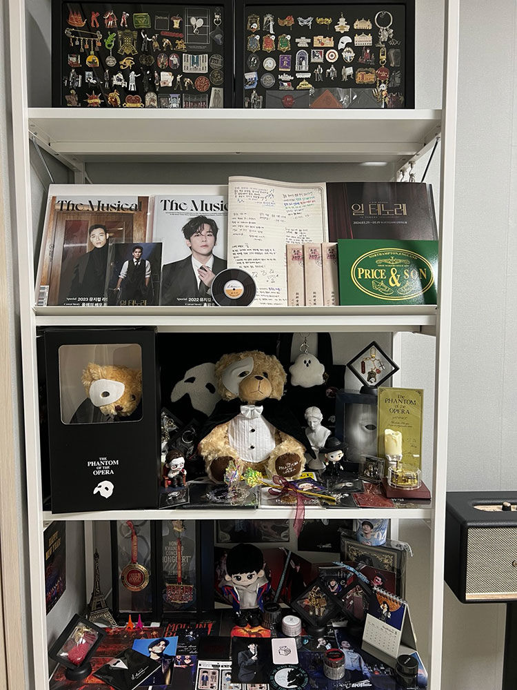 그중 <오페라의 유령> 존을 자랑하고 싶습니다. 재작년에 버킷리스트 중 하나였던 ‘오페라하우스에서 <오페라의 유령> 보기’를 달성했는데, 그때를 기념하기 위해 호주에서부터 유령 가면과 팬텀 곰돌이 인형을 안고 돌아왔습니다. 일본에서는 <오페라의 유령> 노래가 나오는 오르골을 사 오기도 하는 등 여행하는 곳마다 유령 굿즈가 보이면 모으고 있습니다. -