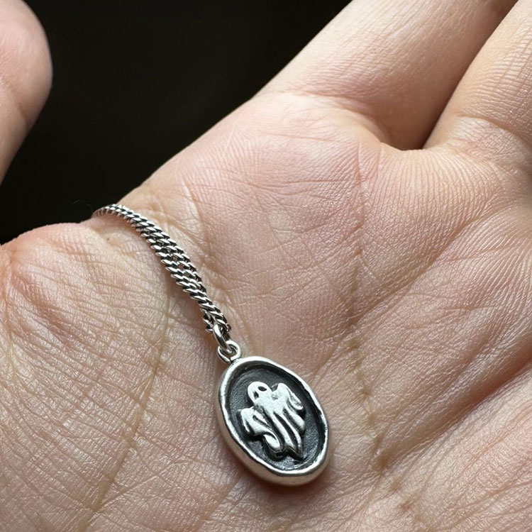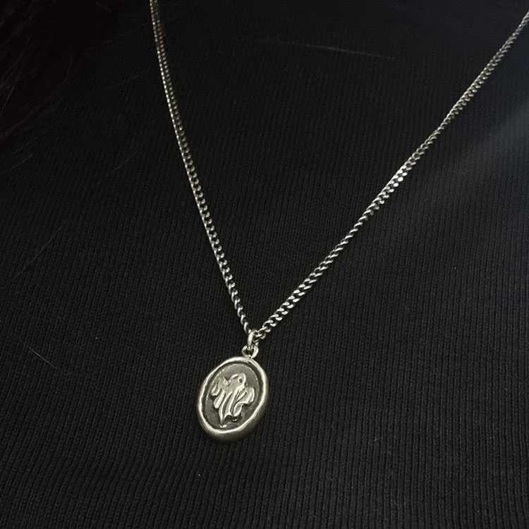 지금까지 만든 모든 결과물 중 제가 가장 마음에 드는 작품입니다. 새 작품을 만들러 공방에 가는 길, 아이디어가 없어 걱정이었습니다. 그런데 갑자기 제가 좋아하는 유령을 빈티지 느낌으로 만들어 보자는 생각이 들어 바로 만들게 되었습니다. 처음에는 매끈한 타원 모양이었는데 빈티지 느낌을 내려고 일부러 테두리도 조금 울퉁불퉁하게 다듬었습니다. 원하는 느낌이 거의 완벽하게 표현되어 만든 후에도 가장 잘 착용하고 다니는 목걸이입니다.