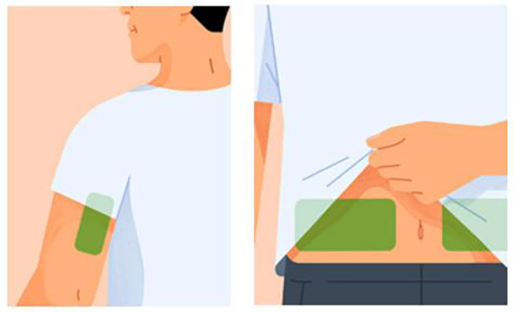 팔 뒷부분 혹은 복부에 부착할 수 있습니다. 저는 팔 뒷부분에 부착했습니다. 위쪽은 부착했을 때의 모습입니다.