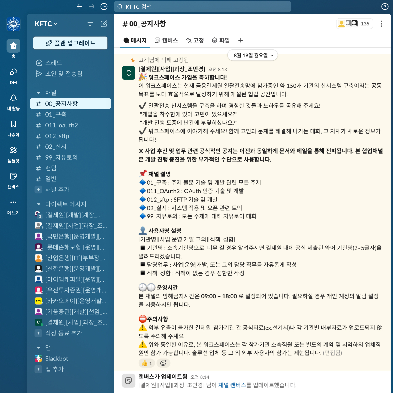 슬랙은 어디까지나 소통을 위한 채널이기에 그 외 목적으로 오용되지 않도록 주의했습니다. 사설 인터넷망에서 개인 단말로 활용할 수 있다 보니, 우리 원과 참가기관의 대외비 문서 등을 올리거나 주고받지 않도록 했습니다. 그리고 ‘공간 참가’는 참가기관 소속 직원 또는 별도의 계약 및 서약 하에 업체 직원만 가능하도록 했습니다(솔루션 업체의 참가는 제한했습니다). 이러한 내용은 공지사항 채널을 통해 한 번 더 명확히 공지했습니다.