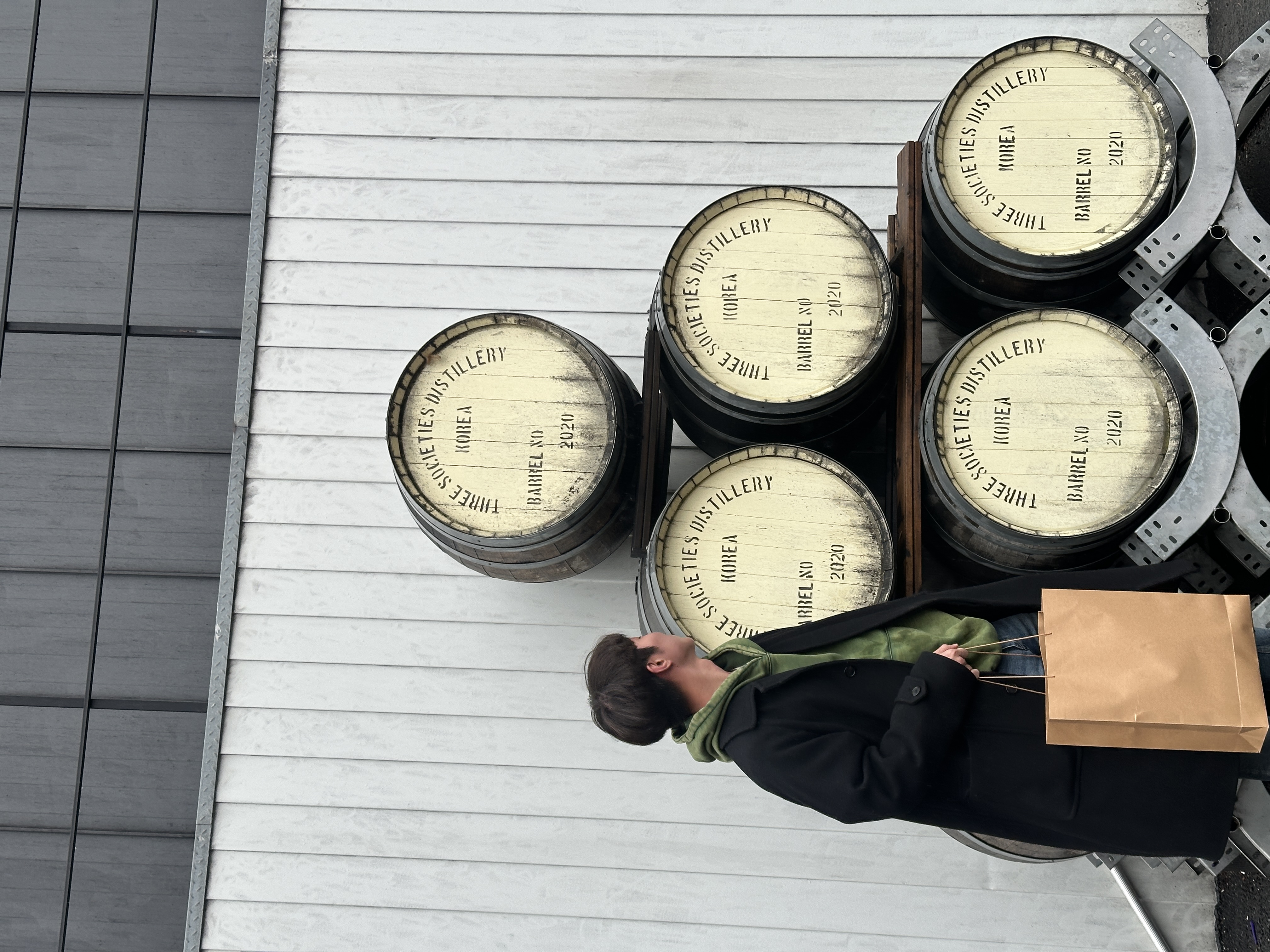 증류소에 도착하면 오크통들이 줄지어 반겨줘요. 입구에 놓인 오크통은 2020년 기원 위스키가 시작될 때부터 숙성한 통이에요.