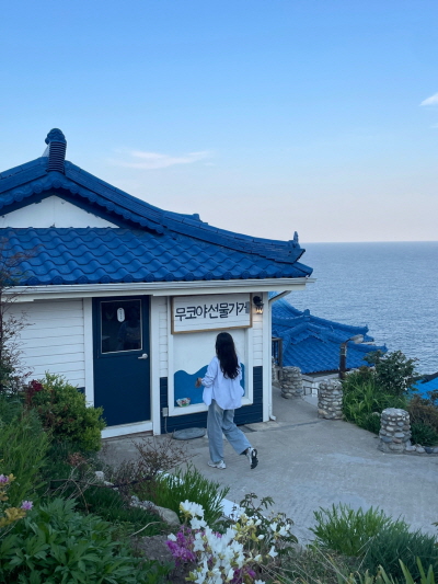 논골담길은 벽화마을이에요. 골목을 따라 올라가면 묵호 등대에도 갈 수 있답니다. 사실 벽화에는 크게 감흥이 없는 편인데요. 그래도 높이 올라가서 보는 마을의 풍경이 좋았습니다. 무엇보다 무코야 선물 가게는 이번 여행 최고의 포토 스팟 중 하나입니다! 무코야 선물 가게에 들어가는 설정샷도 하나 남기고, 가게 옆쪽으로 가서 파란 하늘-파란 지붕-파란 바다 조합으로 사진 찍는 것도 추천해 드려요!