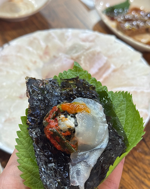 일정을 끝내고 저녁으로 가기 좋은 횟집입니다. 밑반찬부터 장난 아닌 맛집이더라고요. 왜 집 근처에는 이런 맛집이 없는 걸까요? 저는 남기더라도 풍족하게 먹자는 주의라서 2명이 모둠회를 시키려고 했는데요. 사장님께서 간단회면 된다고 하셨어요. 사장님 양심 100점. 이런 집이 보통 맛집이던데…밑반찬 보고 기절할 뻔했습니다. 편육, 떡갈비, 새우, 무침회, 계란샐러드, 소시지전, 버섯전, 파김치, 다시다가 나오는 엄청난 곳이에요. 밑반찬만 맛있느냐? 아니요! 간단회가 하나도 간단하지 않았습니다. 무엇보다 지느러미를 많이 주시구요. 사장님 추천 쌈 조합에 청하 한잔이면…이게 행복이죠. 뉴동해관광호텔(뒤에서 추천 예정)을 예약하실 분들 꼭! 무조건! 필히! 제주댁도 방문해 주세요.