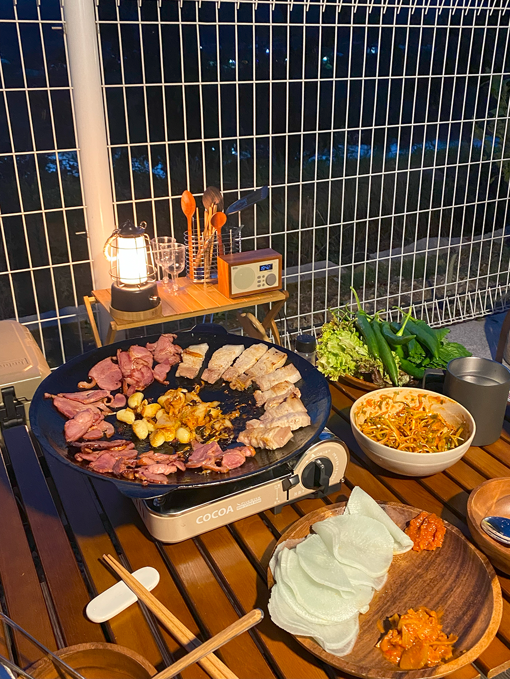 - 아무리 맥주를 먹고 간식을 먹어도 옆 텐트에서 삼겹살 내음이 넘어오면 귀신같이 배가 고파집니다. 빠르게 저녁을 준비해서 둘러앉습니다! 저녁은 굳이 말로 설명하지 않고 사진으로 대체하겠습니다 ^.^