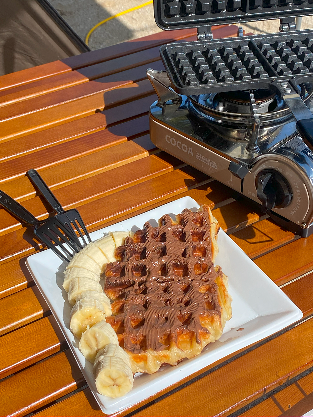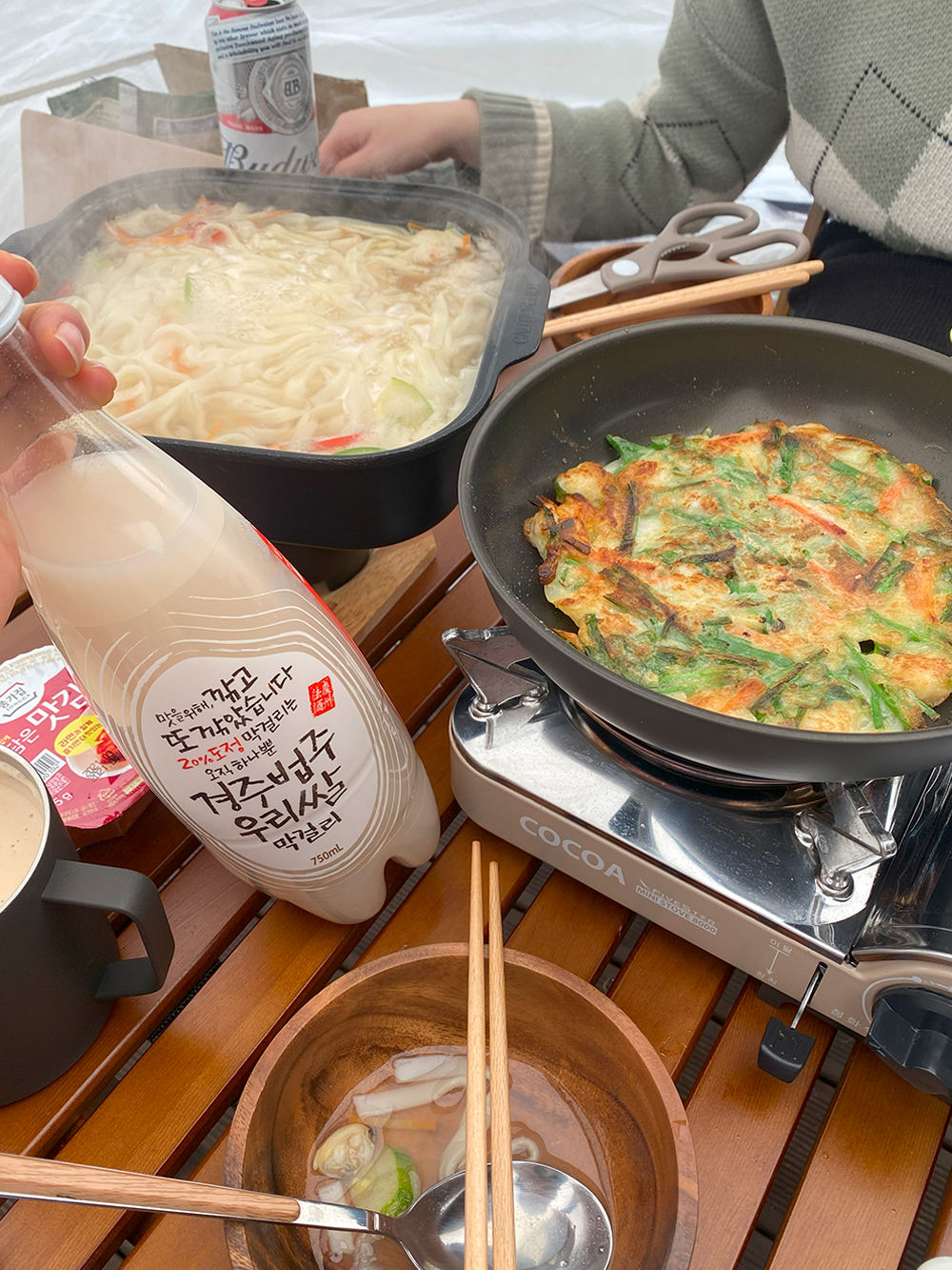 - 한강 뽀글이를 좋아하는 분들이라면, 야외에서 먹는 라면이 얼마나 꿀맛인지 아실 겁니다! 둘째 날 아침 겸 점심은 대개 라면(Simple is the Best)으로 떼웁니다! 아주 가끔 레이트 체크아웃을 하면 토스트나 크로플을 만들어 먹을 때도 있어요.