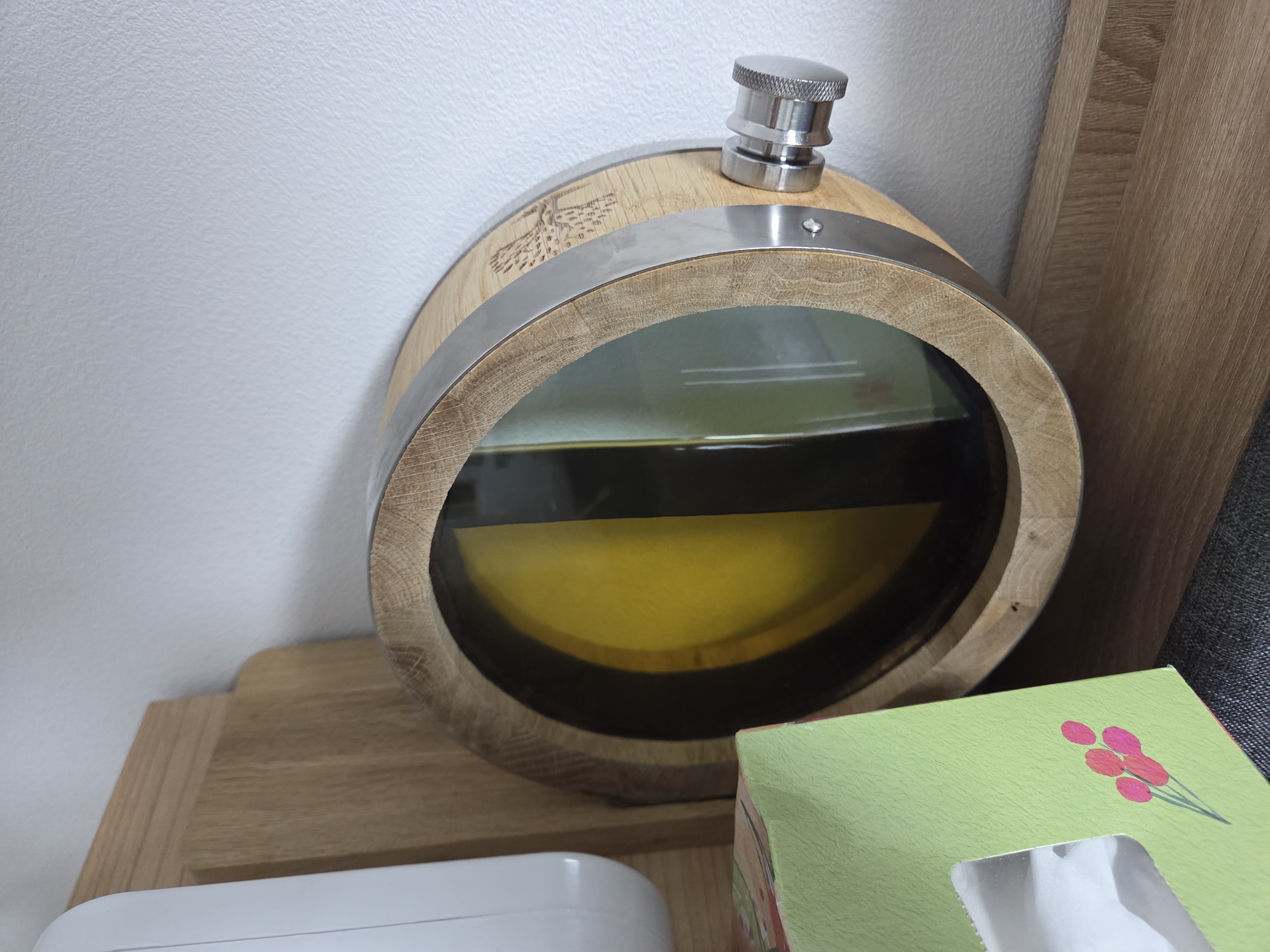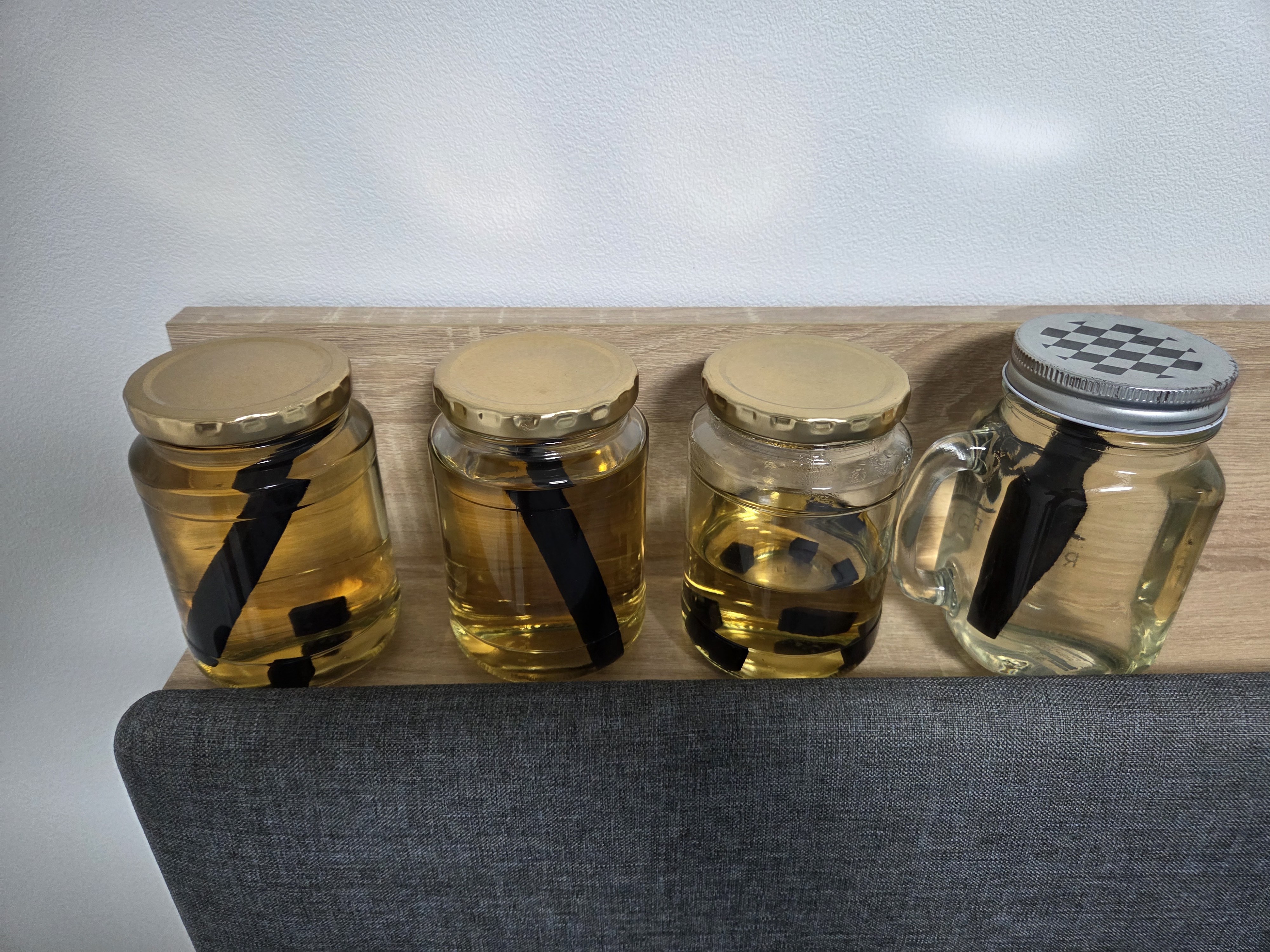 지금 저희 집에는 지금 도수 60도의 소주와 38도의 복숭아 브랜디가 오크 숙성이 되고 있습니다. 가족들과 마시기 위해 빠른 숙성을 하려고 오크 스틱을 사용했는데, 앞으로 만들 술은 가능하면 오크통에 숙성하려고 합니다. -