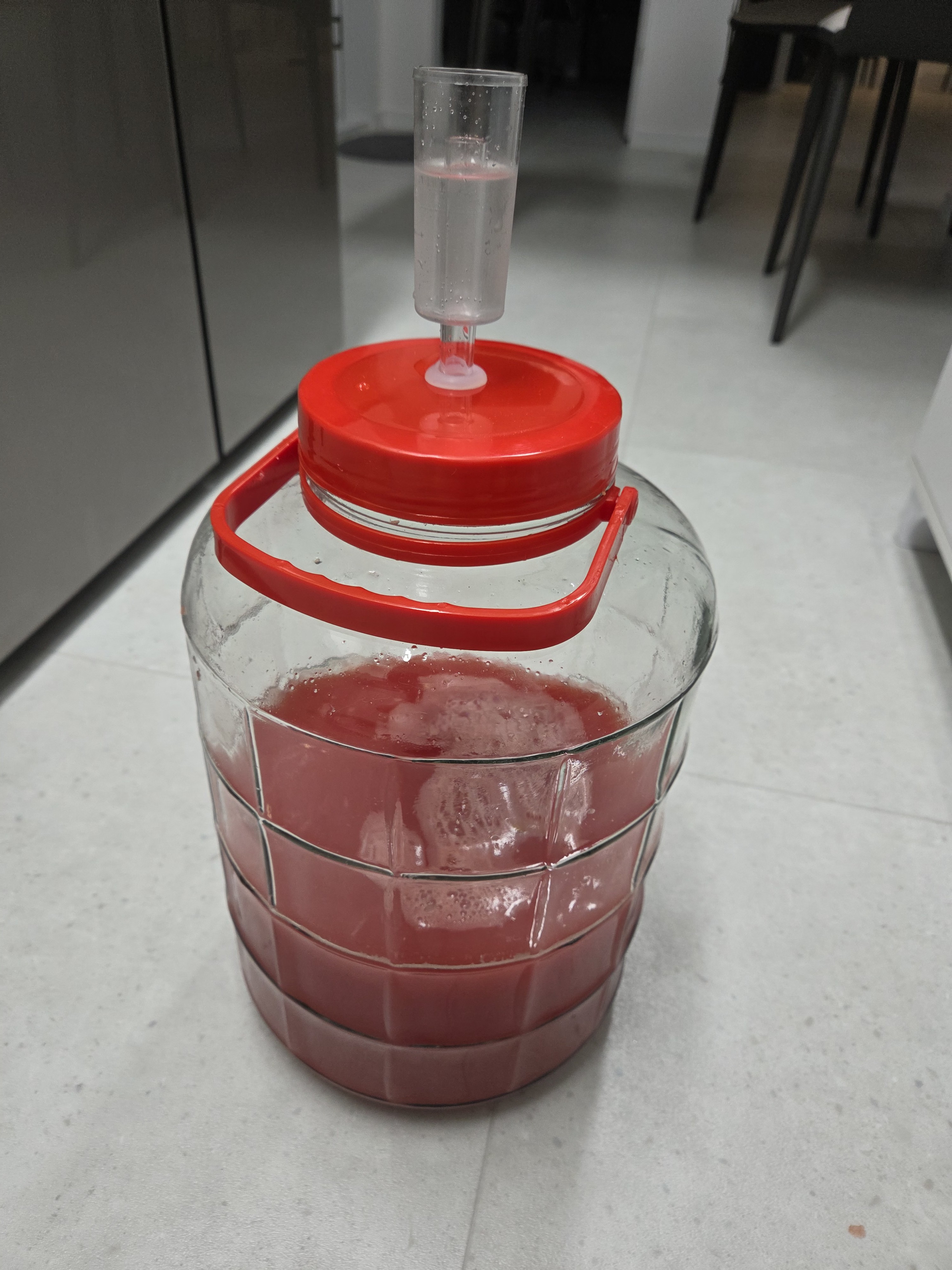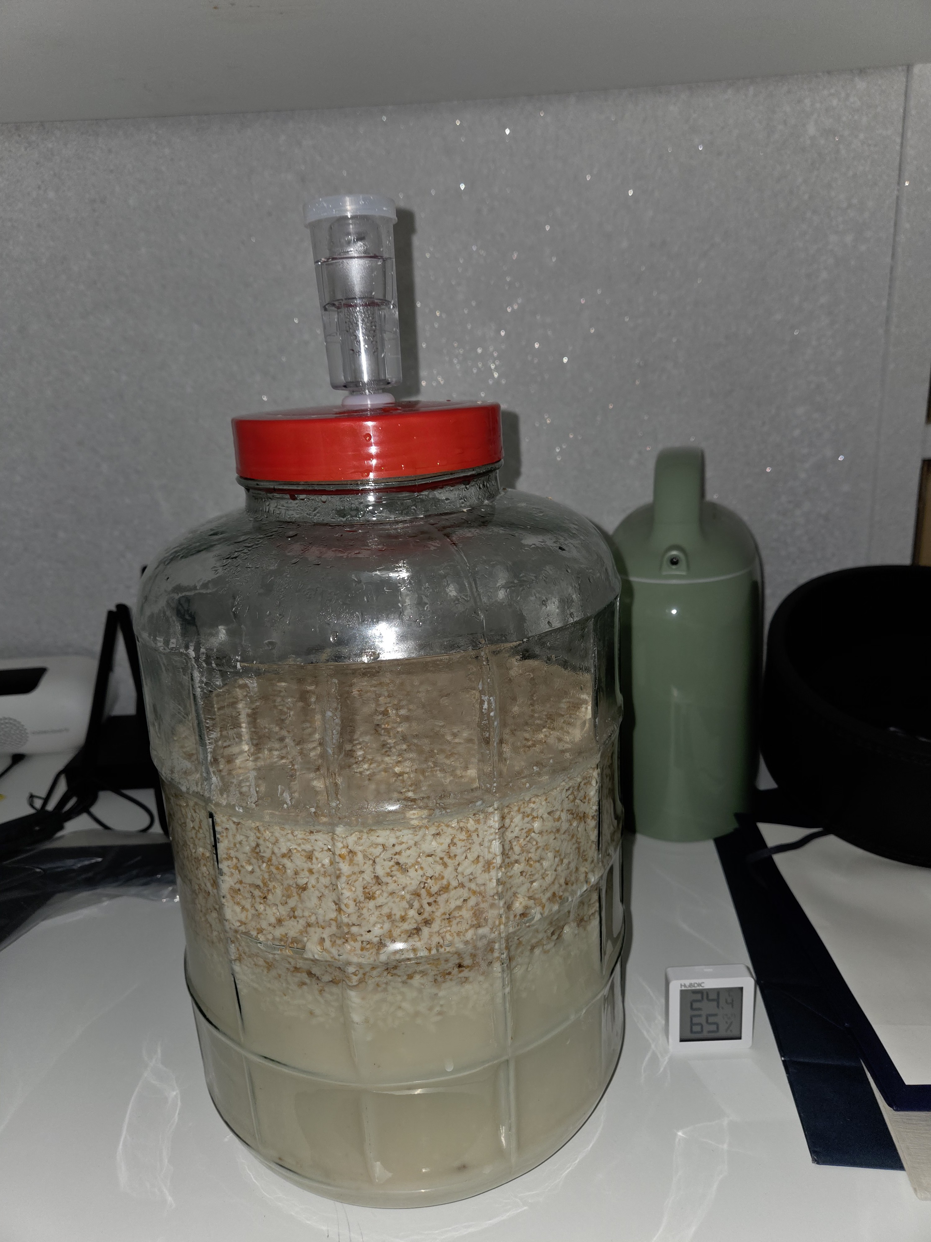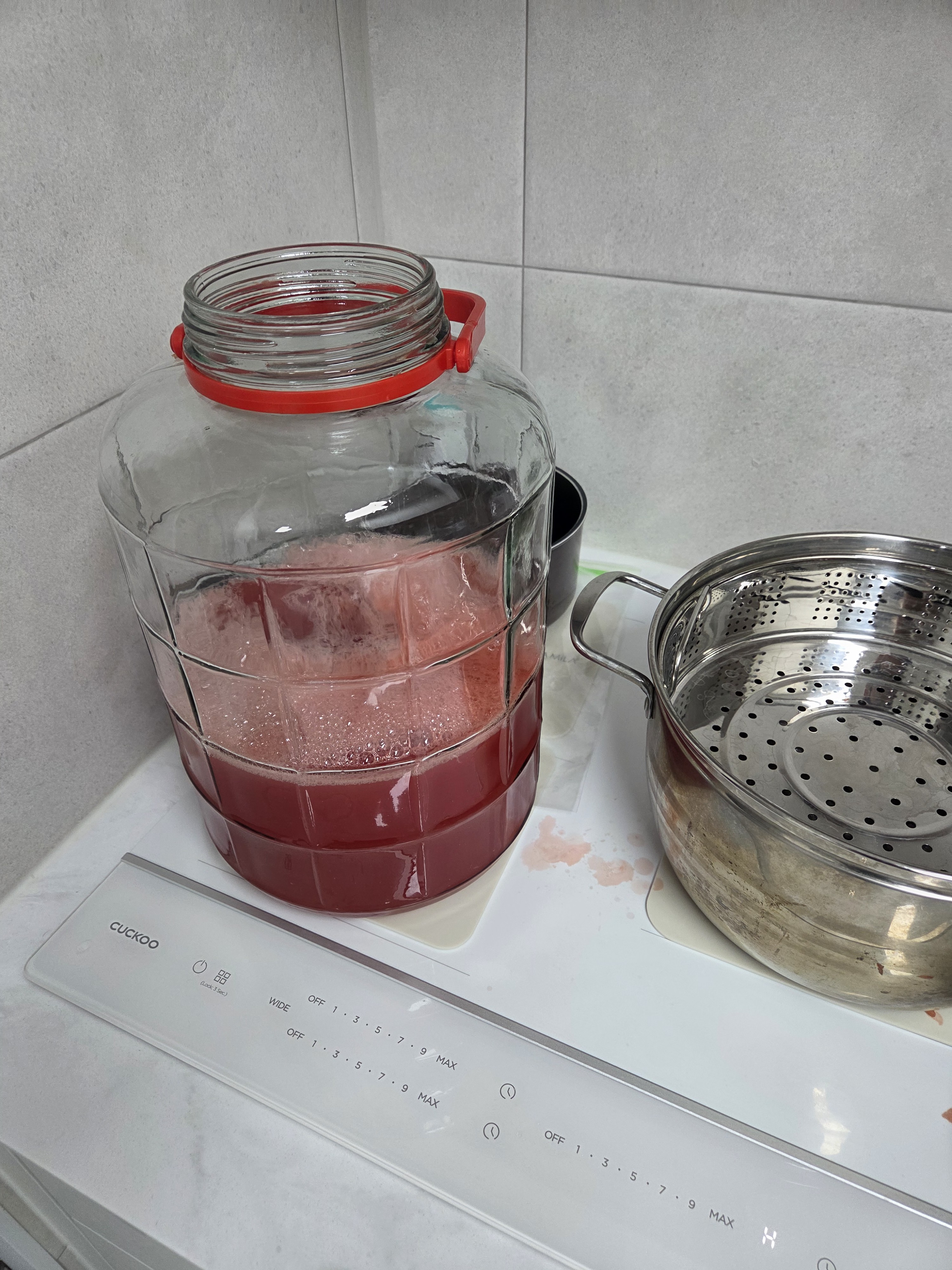 효모가 당분을 먹고 알코올 발효를 한다고 말씀드렸는데요, 조금 더 자세히 말씀드리자면 ‘산소가 있을 때는 이산화탄소를 뿜으며 증식’하고, ‘산소가 없을 때는 이산화탄소를 뿜으며 알코올을 만든다’라고 정리 드릴 수 있습니다. 수박주를 담그고 몇 시간이 되지 않아 활성화된 효모들이 이산화탄소를 뿜뿜 뿜고 있습니다. 발효 초기에는 병 안에 산소가 남아 있으니 효모가 증식할 테고, 산소보다 무거운 이산화탄소가 병 안을 가득 채우면 본격적으로 알코올 발효를 시작할 겁니다. 이제 남은 일은 발효 공간의 온도를 25℃ 아래로 유지하는 일뿐입니다.