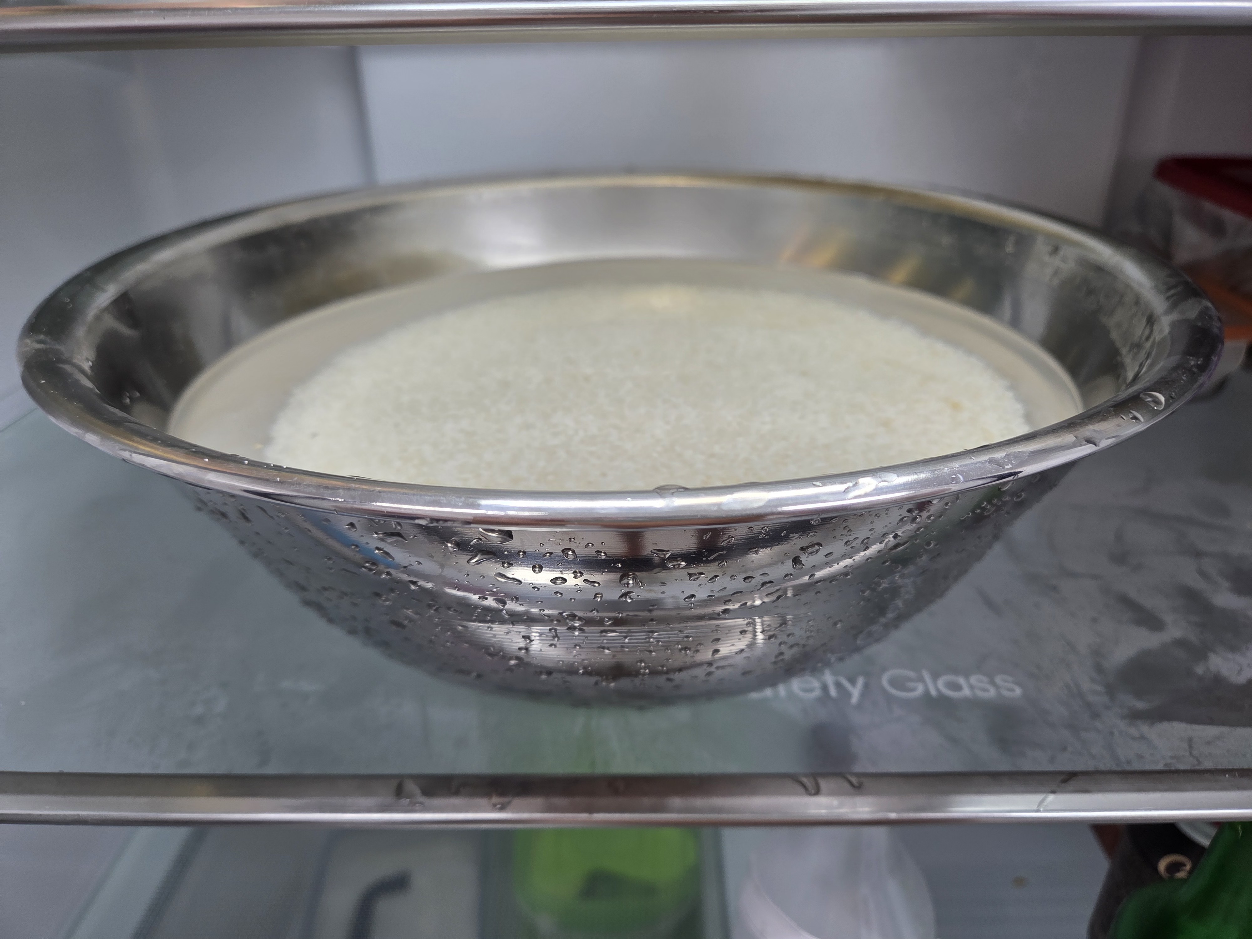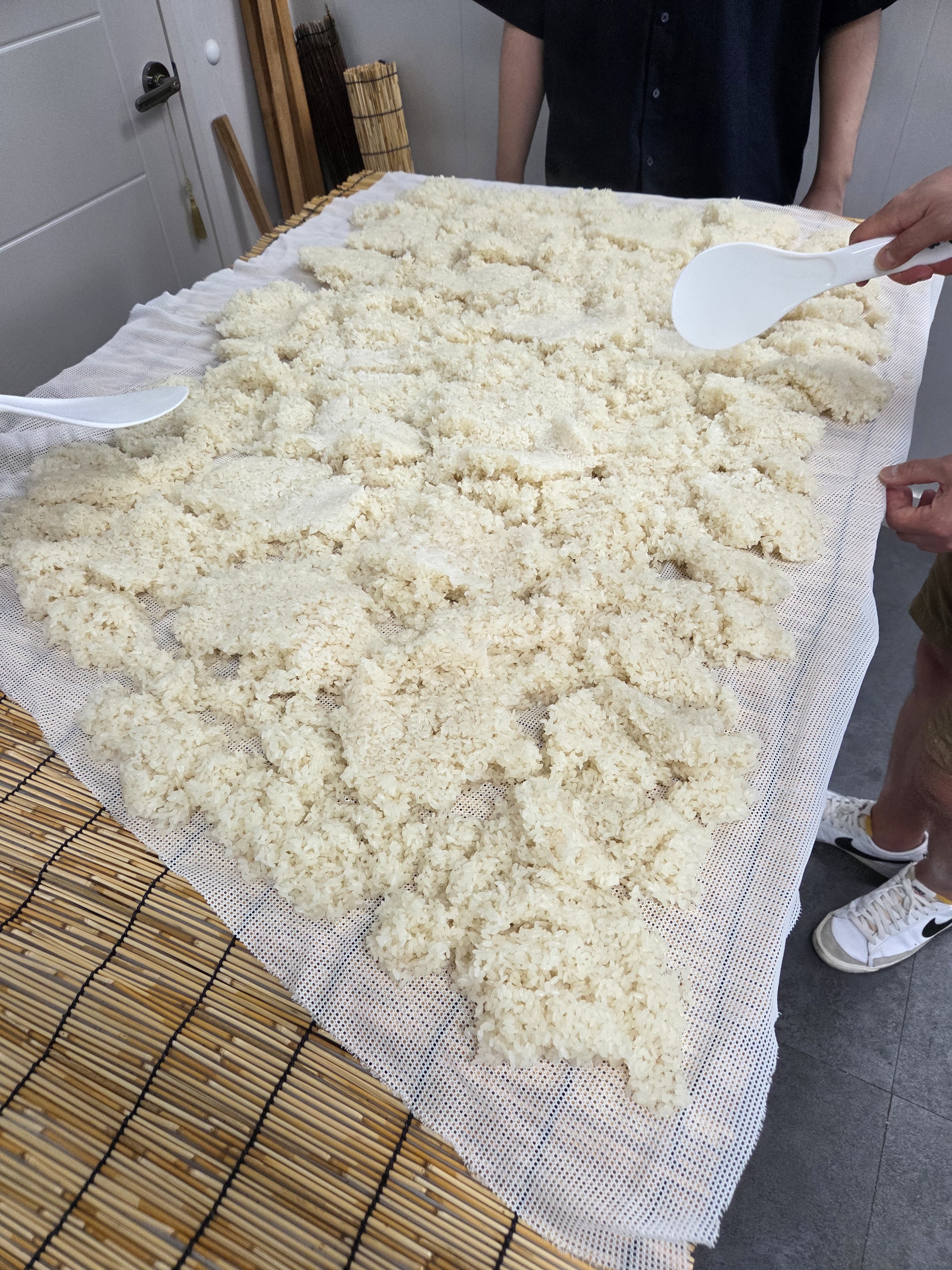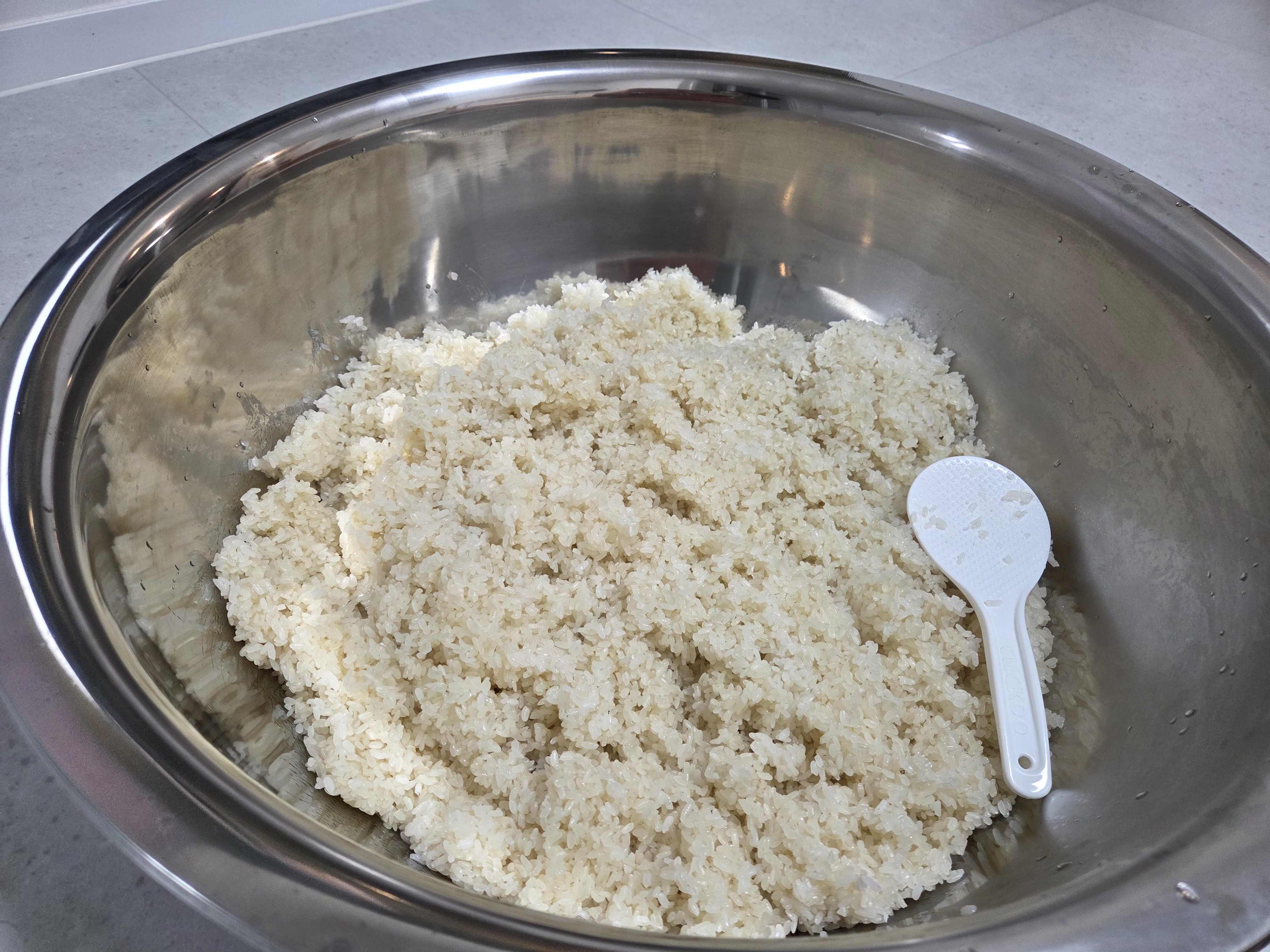 찹쌀도 마찬가지로 깨끗이 씻은 후 3시간 정도 물에 불리고 1시간 정도 물기를 빼줍니다. 이제는 가루를 내는 게 아니라 고두밥을 지을 건데, 찜기에 면보로 감싼 찹쌀을 넣고 40분 찌고 20분 뜸을 들이면 됩니다. 다 된 고두밥은 효모가 죽지 않도록 차갑게 식히는데, 역시 마찬가지로 선풍기로 식히면 안 됩니다. -