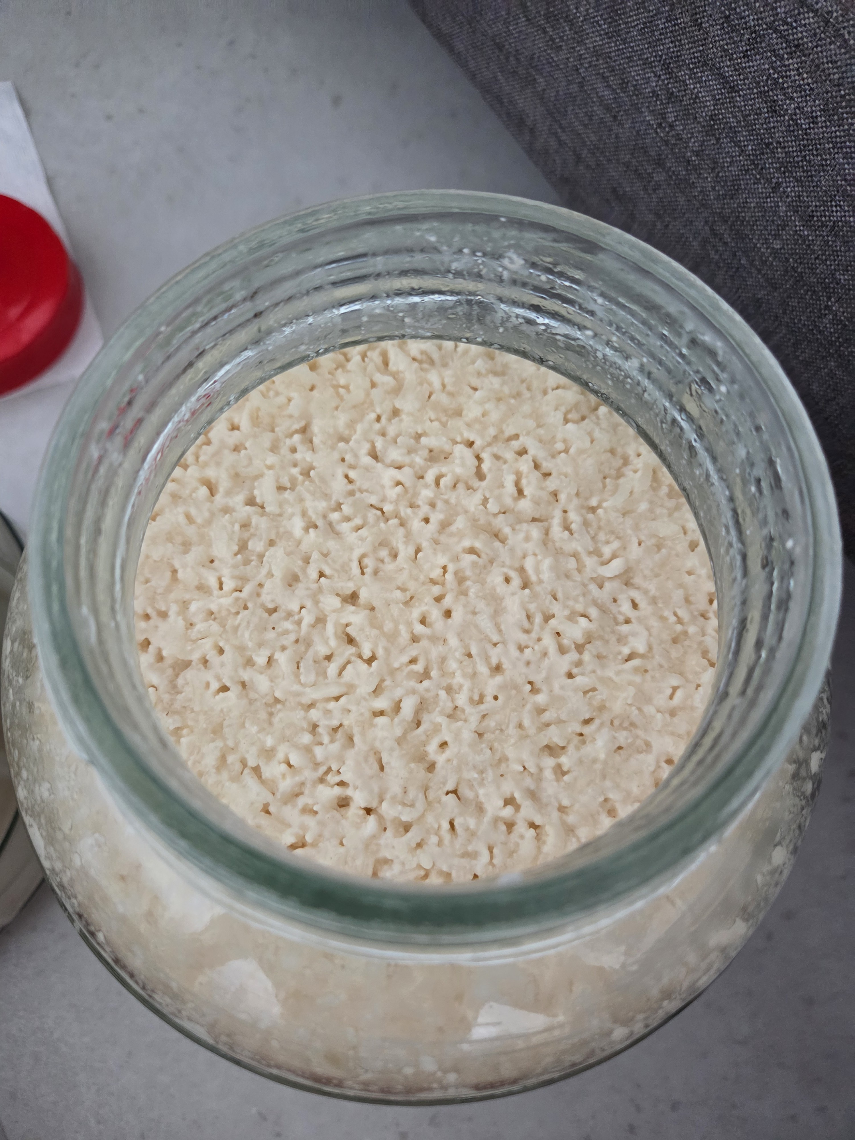 덧술 후 하루가 지나면 쌀이 물을 먹어 아주 뻑뻑해집니다. 이때 잘 소독한 도구로 한 번 휘저어준 다음, 다시 며칠을 기다리면 아래에 물이 생기고 쌀이 떠오릅니다.