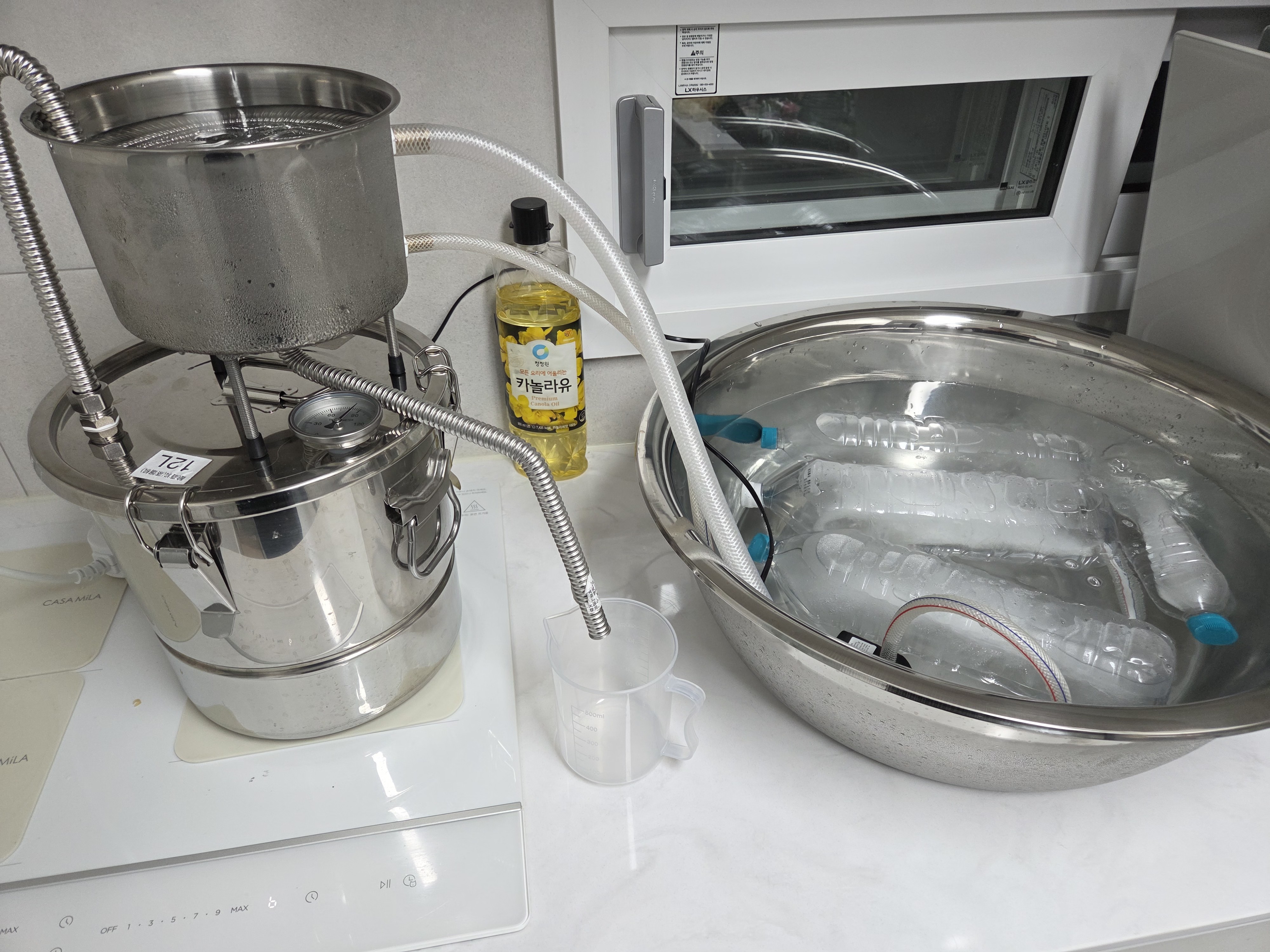 저는 집에서 소주와 브랜디를 내려봤는데요, 소주는 소주용 막걸리를 따로 빚어서 증류했고, 브랜디는 직접 복숭아 와인을 만들어서 증류해 만들었습니다. -